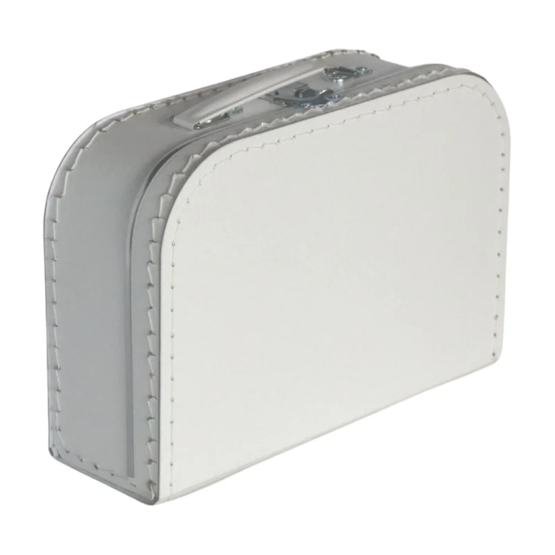 Optioneel kunnen we ook de naam van het kindje op het koffertje bedrukken met vinyl, dit doen we dan met zilveren letters.