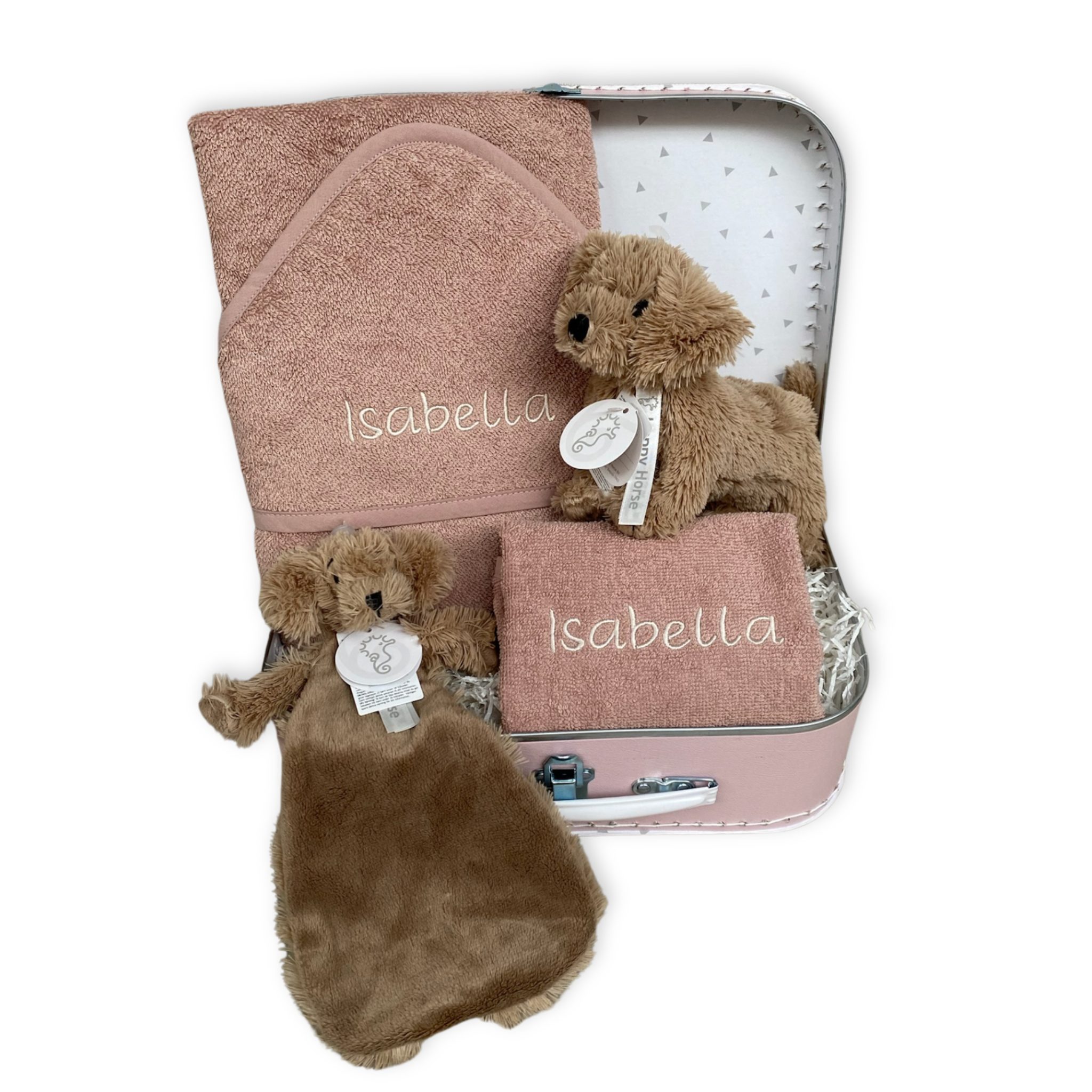Je kunt deze cadeau koffer helemaal naar wens samenstellen. Kies zelf de kleur van de badcape, het slabbetje en van het koffertje.