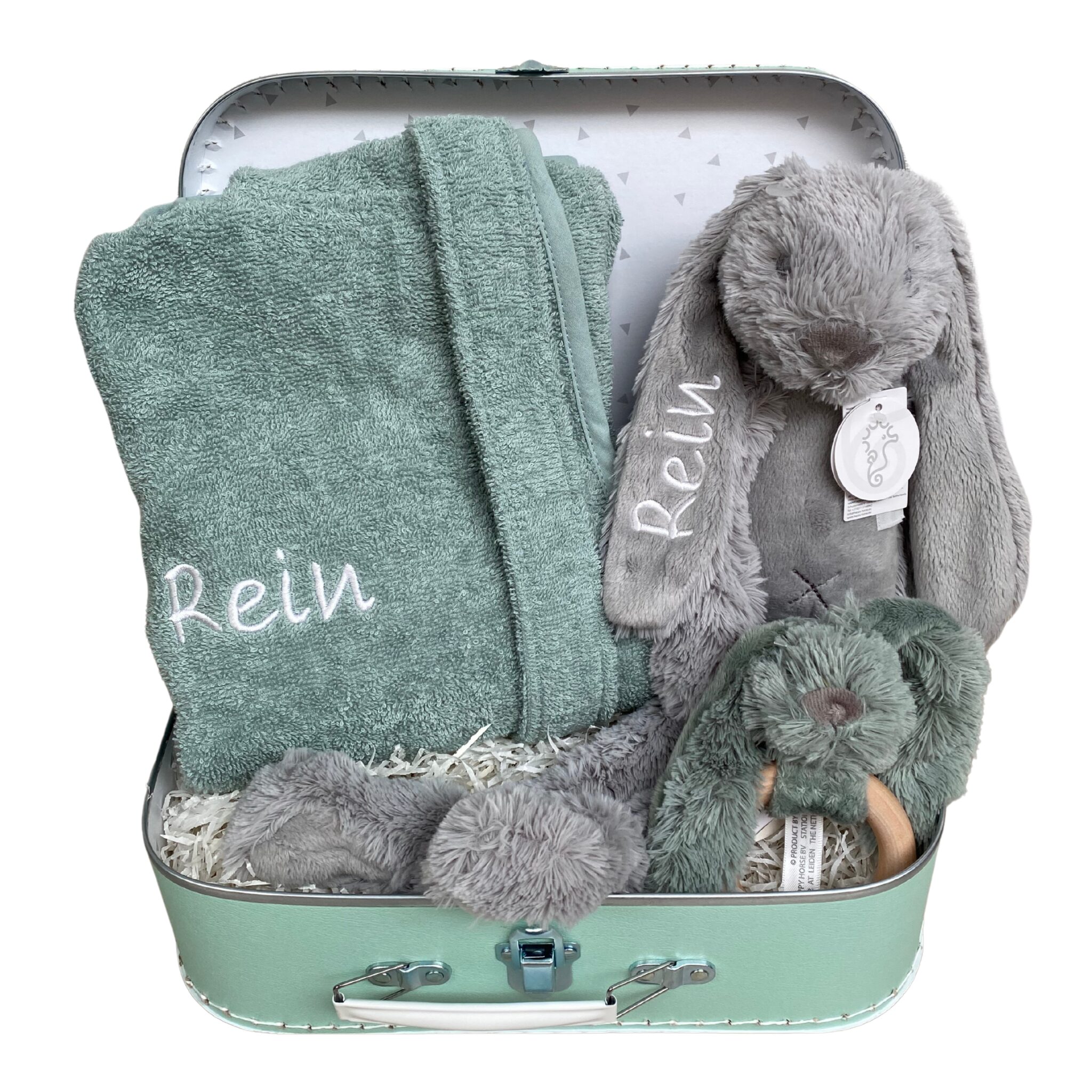 Een fijn cadeau om te geven aan een (pasgeboren) jongetje of gewoon, omdat het kan. De cadeautjes gaan tijden mee! De zachte badjas in de maat 1-2 jaar en het knuffelkonijn personaliseren we met de naam van het kindje. We borduren de naam, dit is duurzaam en veilig. De houten bijtring is leuk om mee te zwaaien en ook deze is voor een deel lekker zacht. Fijn voor doorkomende tandjes, maar toch zacht voor de handjes.