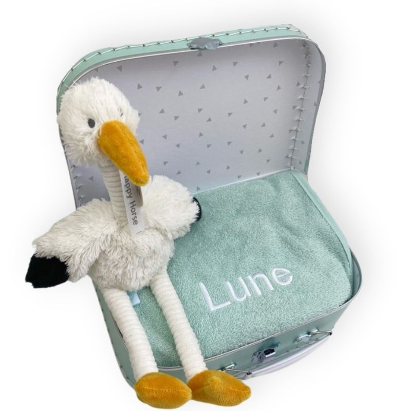 Dit kraamcadeau koffertje is gevuld met een zachte knuffel ooievaar van Happy Horse (34 cm) en een slabbetje. Op de slab borduren we de naam van het kindje.