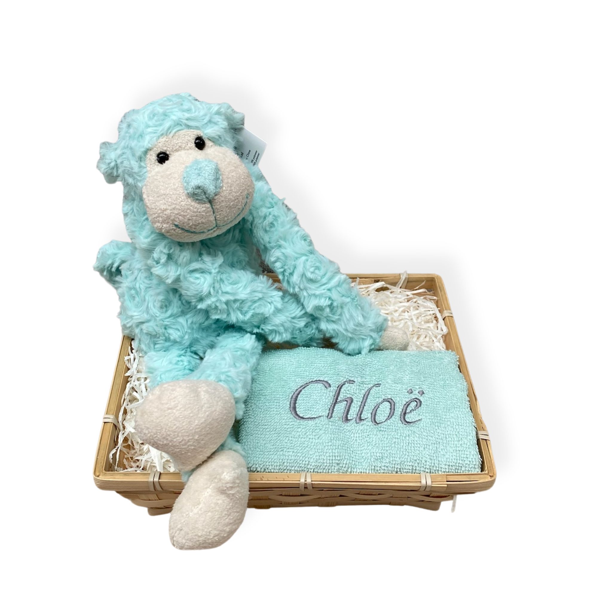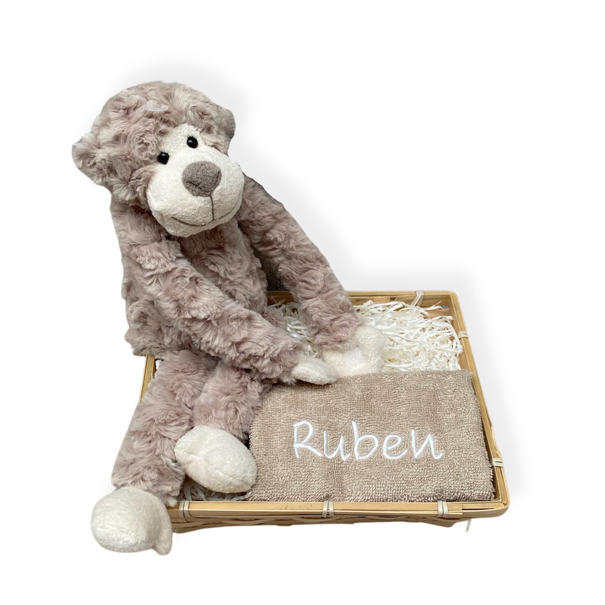 Dit leuke kraammandje is een klein maar persoonlijk en liefdevol cadeautje om de geboorte van een baby te vieren. In dit mandje stoppen we een zacht knuffel aapje en een slabbetje met de naam van het kindje erop geborduurd. Het aapje zal een gezellig vriendje van de baby worden, terwijl het slabbetje zorgt voor een fijne maaltijd met mooie herinneringen.
