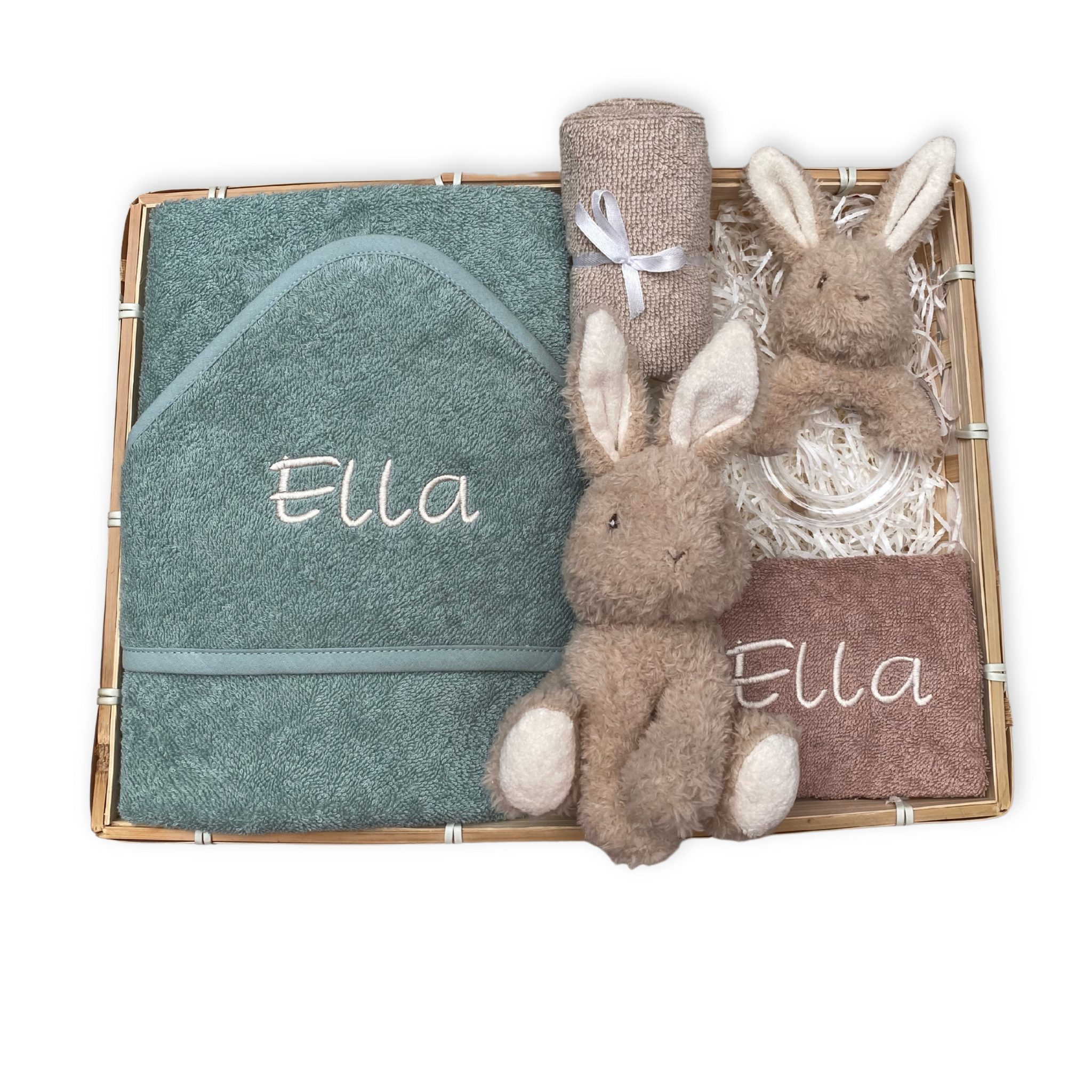 Zoek je een mooi gevulde kraammand met originele en handige kraamcadeaus? We vullen deze kraammand met een zachte badcape en slab waar we de naam van het kindje op borduren. De super zachte Baby Bunny knuffel en de fijne ringrammelaar van het merk Little Dutch mogen niet in dit cadeaupakket ontbreken.