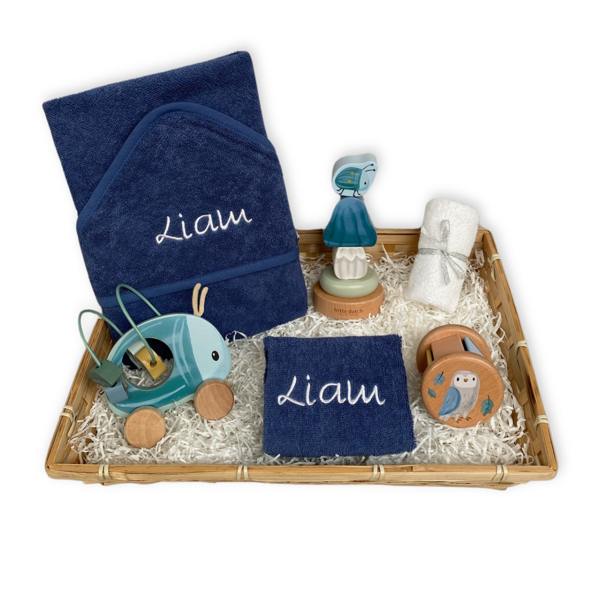 Op de foto zie je een silkblue badcape en slabbetje waarop we met witte letters de naam van het kindje hebben geborduurd. Het lettertype is eigenwijs. Dit geeft de mand een speelse uitstraling. Maar stoere of sierlijke letters staan natuurlijk net zo leuk! Het witte spuugdoekje komt altijd van pas en steekt leuk af bij alle blauwe tinten.