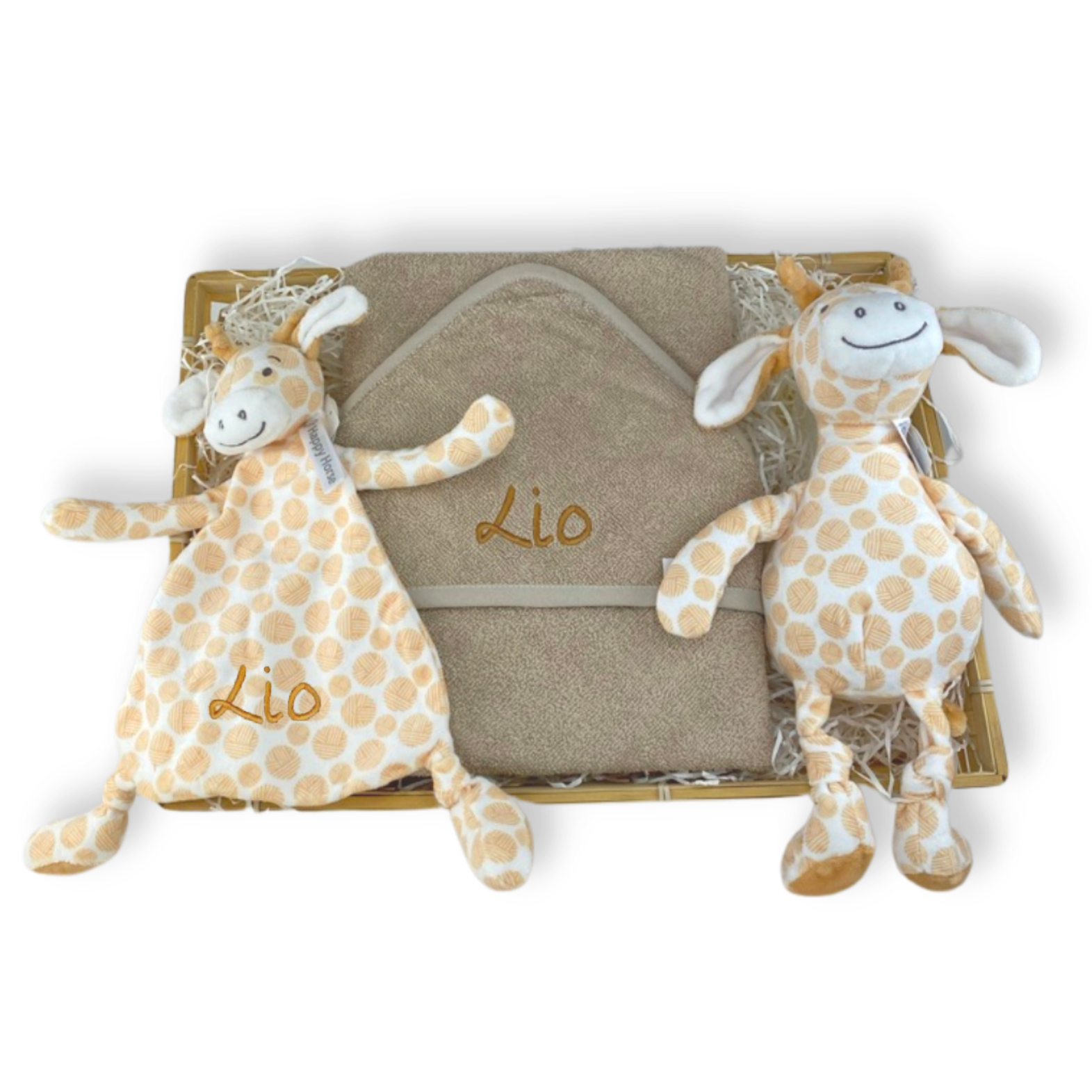 Deze cadeaumand vullen we met leuke kraam- en naamcadeaus. We borduren bovendien de naam van het kindje op de badcape en op het knuffeldoekje Giraf Gessy van Happy Horse. Dat is pas een persoonlijk en nuttig cadeau!