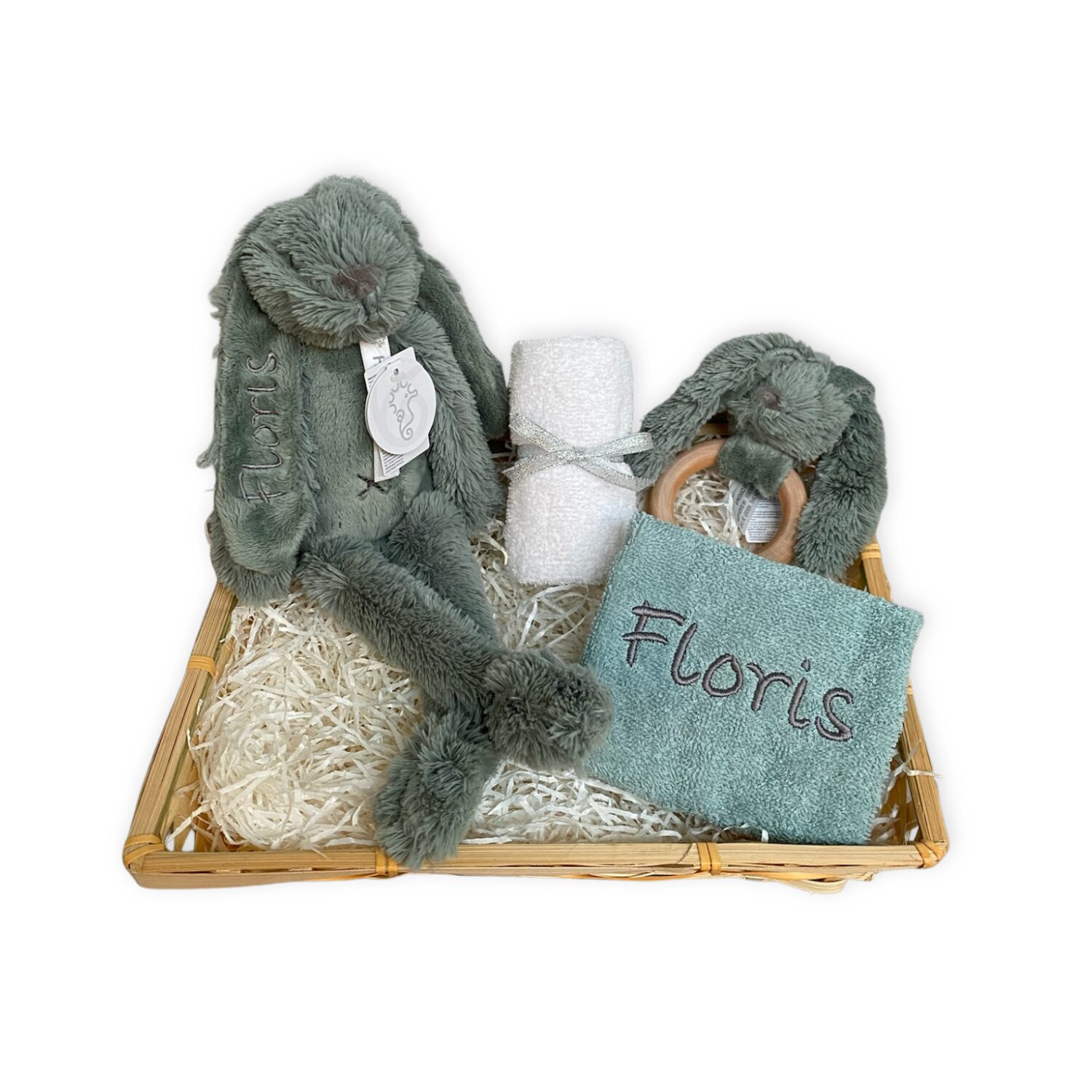 Zo zijn ongelukjes tijdens het eten een stuk minder erg door het slabbetje wat we in de kraammand stoppen. Op het slabbetje borduren we de naam van het kindje. Dat maakt de maaltijd nog leuker! Een altijd handig spuugdoekje mag niet ontbreken. We stoppen ook mooie cadeautjes van Happy Horse in de kraammand: een zacht knuffelkonijn en een fijne houten bijtring. Op het oor van het konijn borduren we de naam van het kindje.