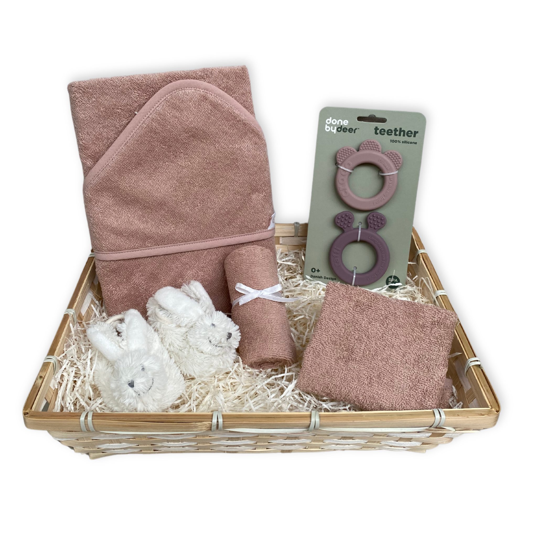 We borduren de naam van het meisje op de badcape en op het slabbetje. Daarnaast zitten er nog super zachte slofjes van Happy Horse, handige siliconen bijtringen van Done by Deer en een altijd van pas komend spuugdoekje in de kraammand.