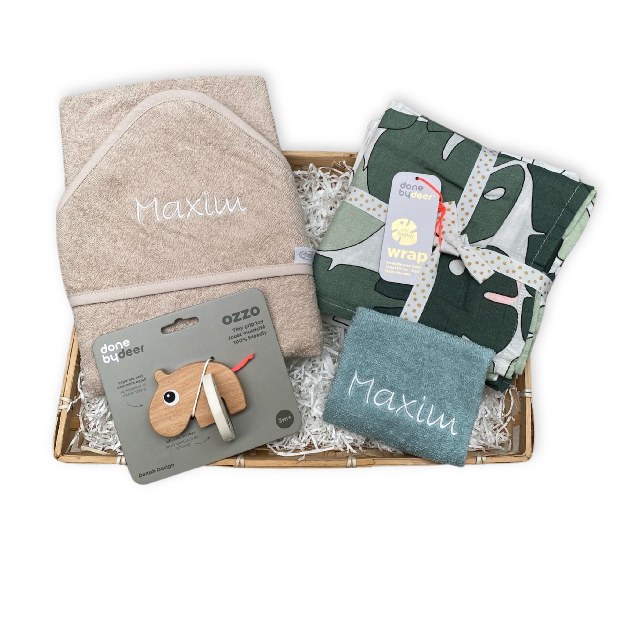 De beige en groene kleuren kunnen voor zowel jongens als voor meisjes. We stoppen een zachte badcape en slabbetje waar we de naam van het kindje op borduren in de mand. Daarnaast kunnen de handige swaddles van de Tiny Tropics lijn van Done by Deer niet ontbreken. De mand is compleet met het nieuwe Ozzo voel en ontdekspeeltje van Done by Deer.