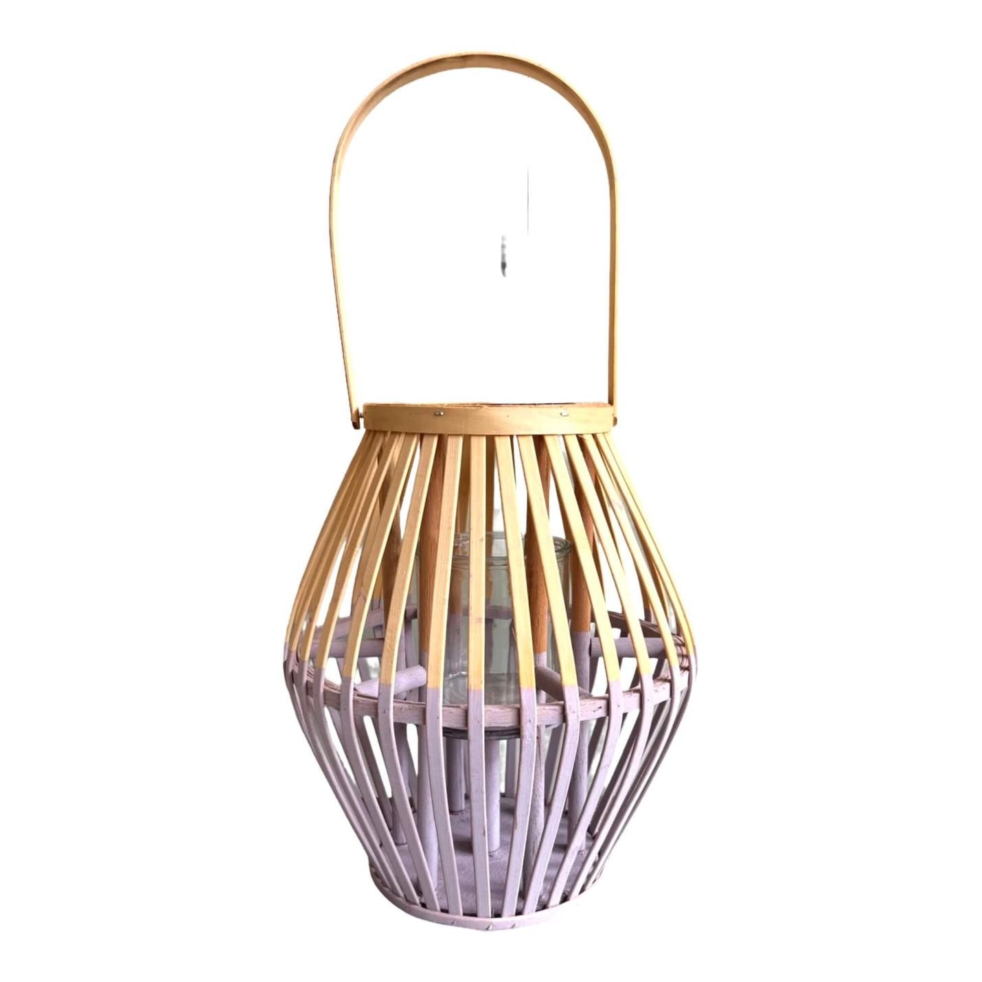 Deze lantaarn is gemaakt van bamboe stroken die een taps toelopende vorm creëren, en is de lantaarn deels geschilderd in een zachte Lila kleur, wat een rustieke en moderne uitstraling geeft. Het bovenste gedeelte van de bamboe stroken is naturel gelaten, wat zorgt voor een mooi contrast en een natuurlijke uitstraling.