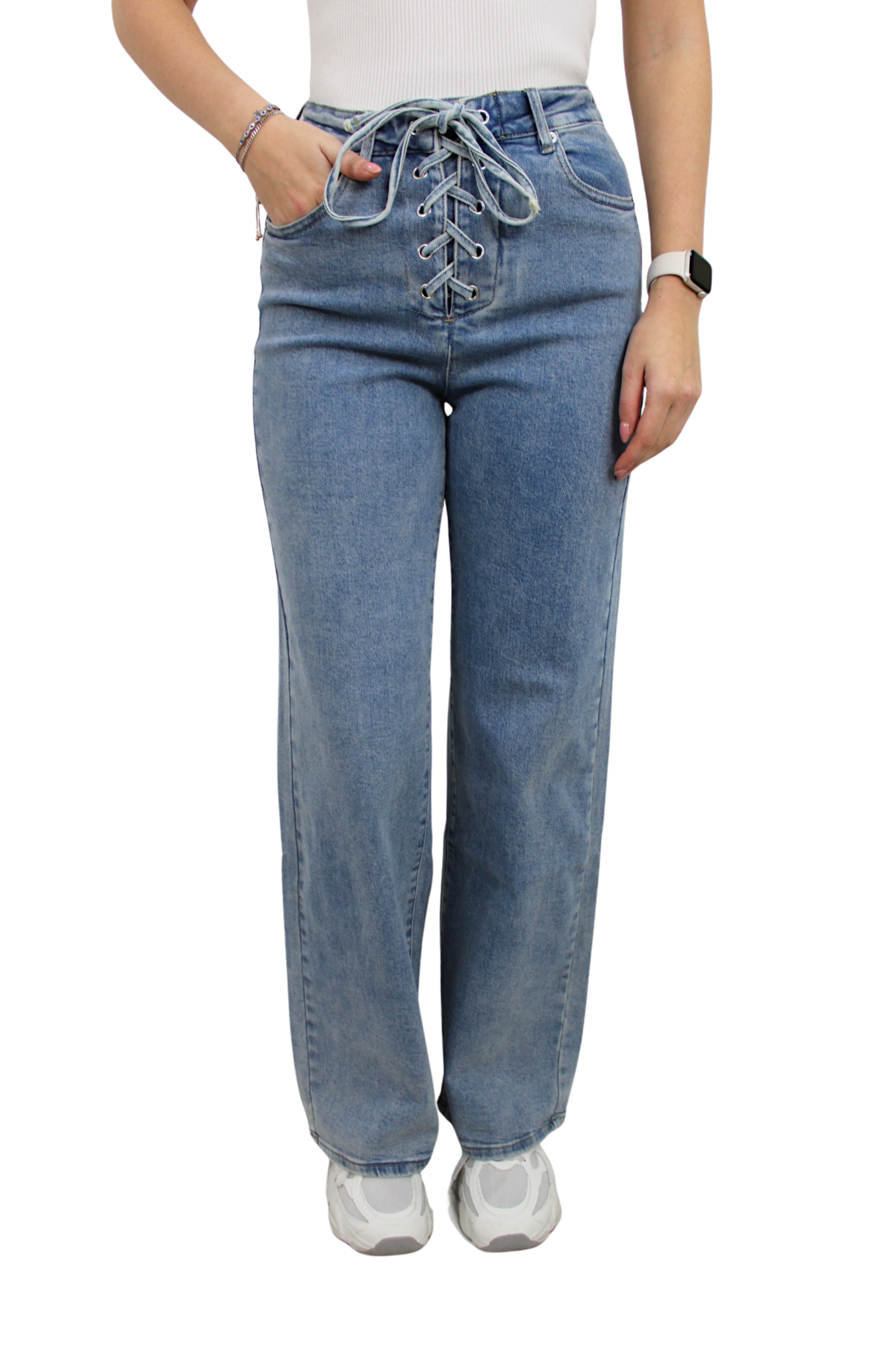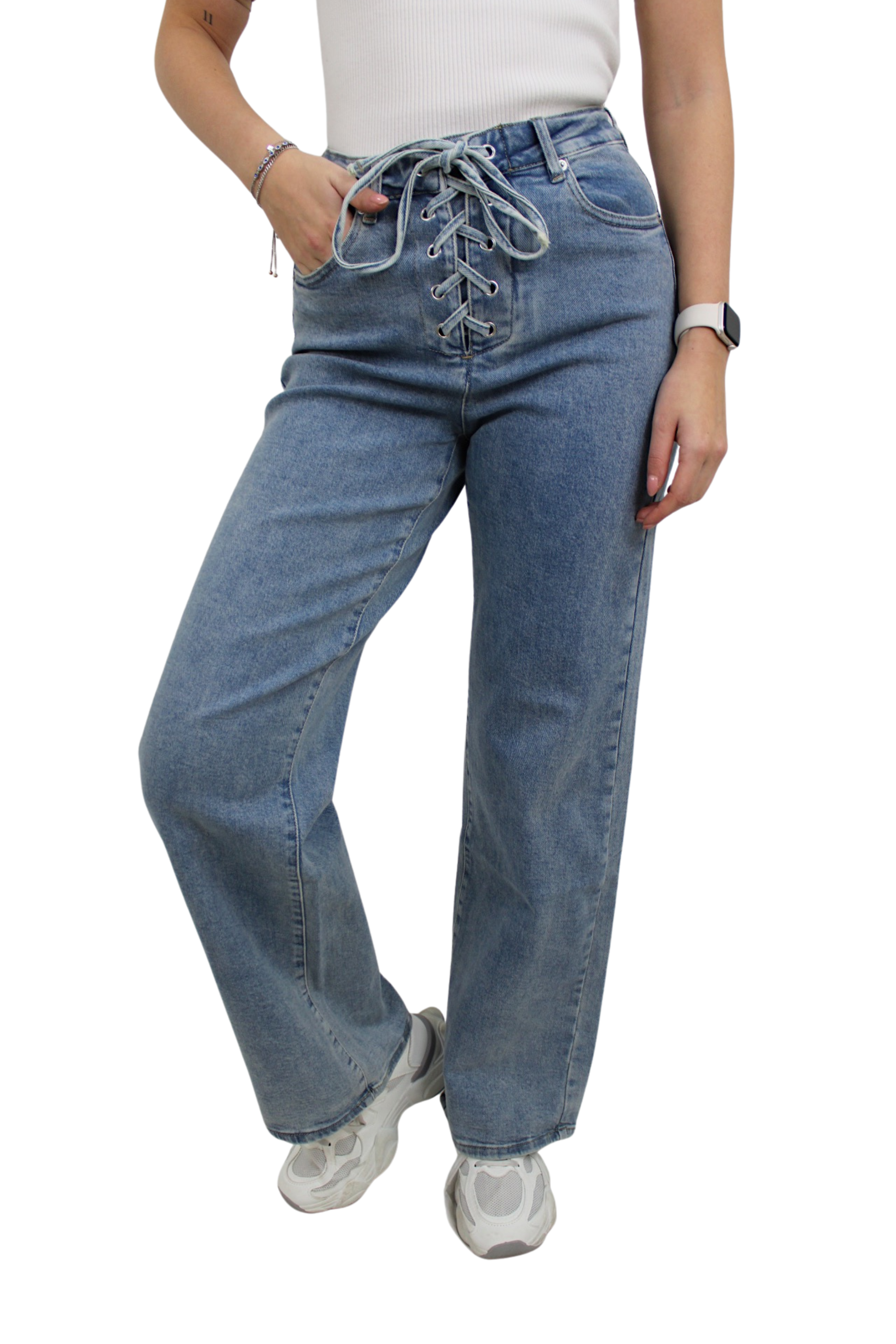 - De jeans kun je met een knoopje en de veters sluiten.