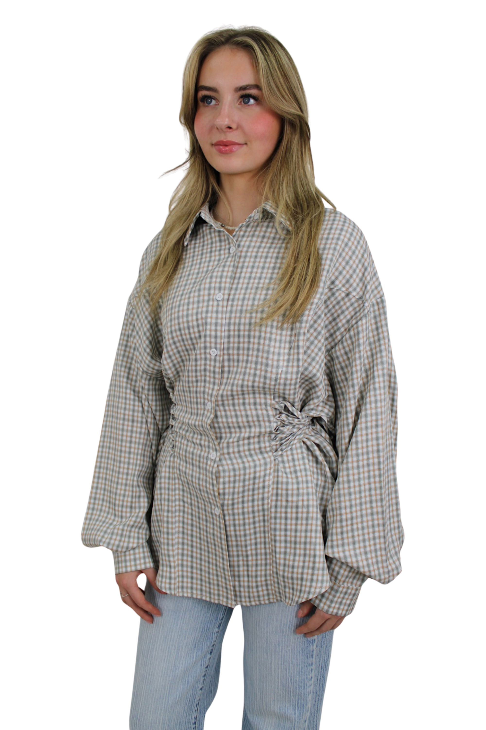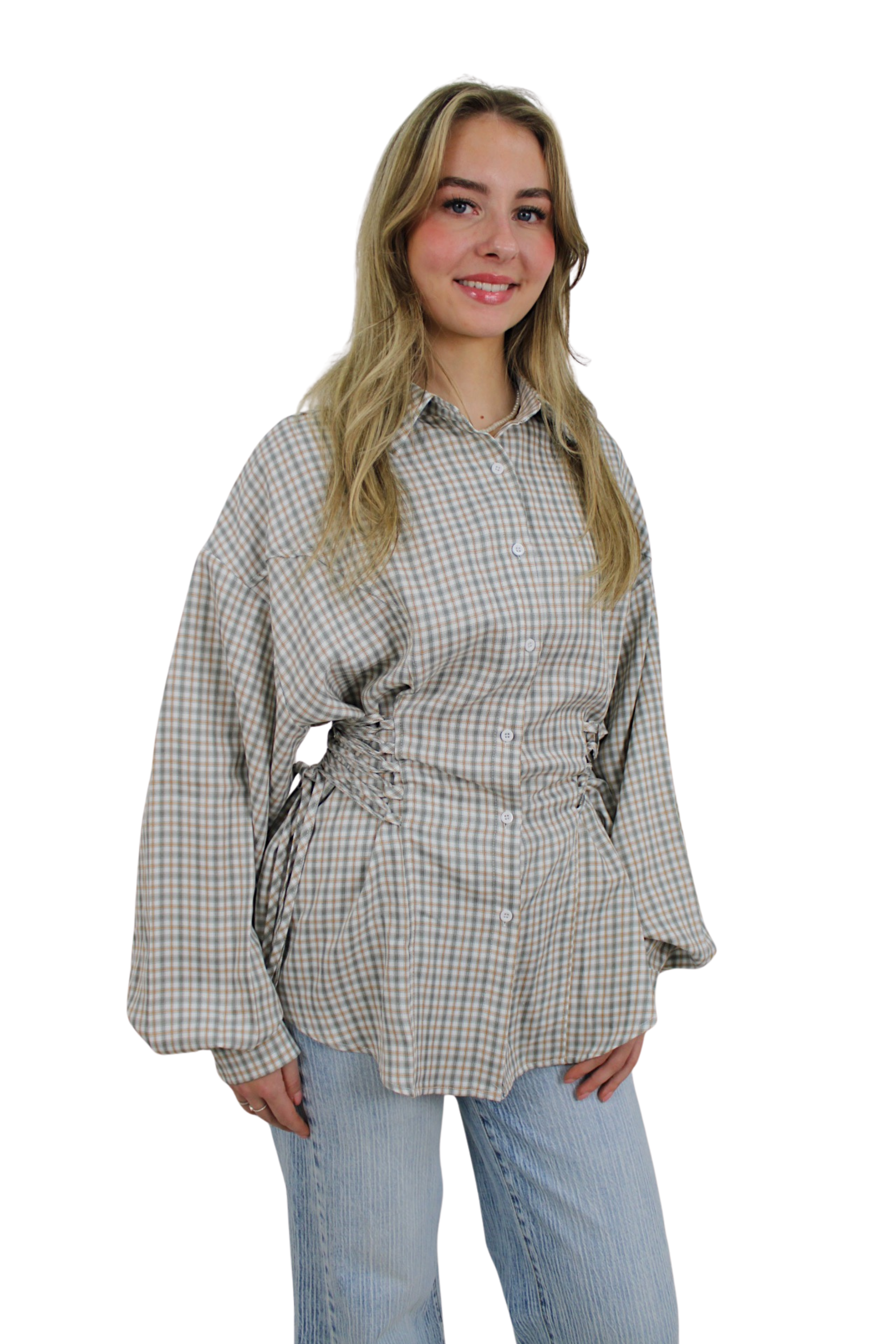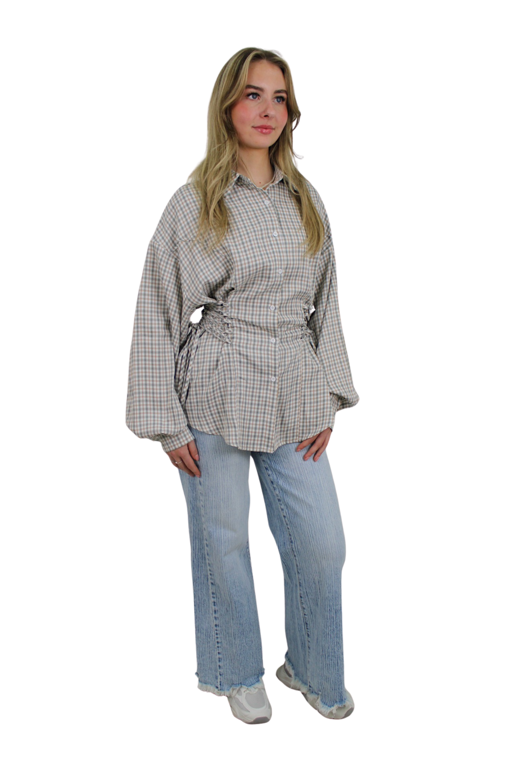 - De blouse kun je zelf naar wens tailleren in de taille.