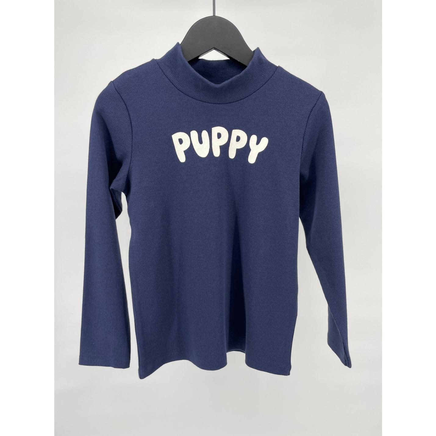 Donkerblauwe longsleeve met turtleneck van Mini Rodini. Hij is uitgevoerd in donkerblauwe ribstof en heeft op de borst in witte letters de tekst ‘puppy’, zie foto’s.