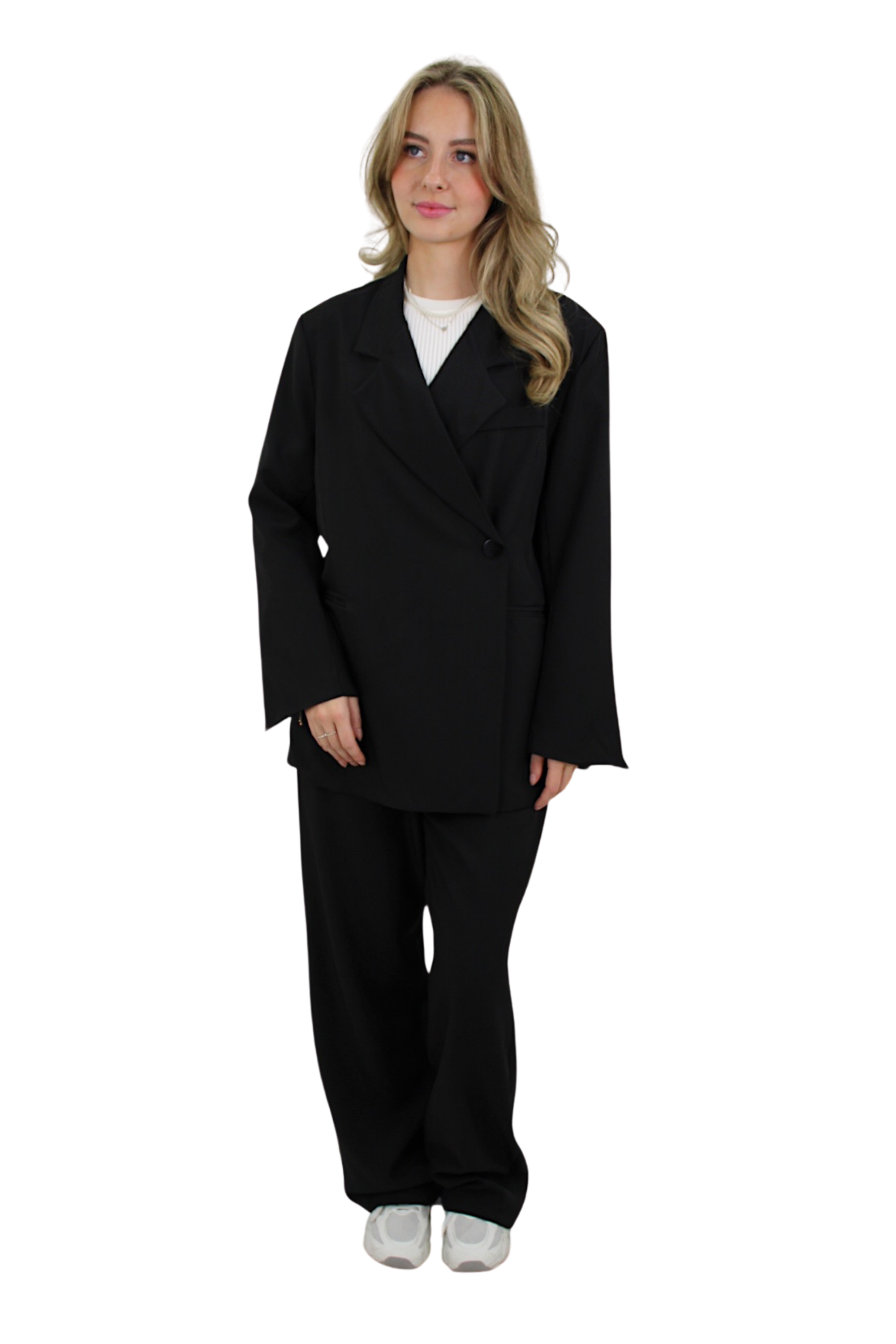 - De broek bevat stretch in de taille band en de blazer heeft een oversized fit.