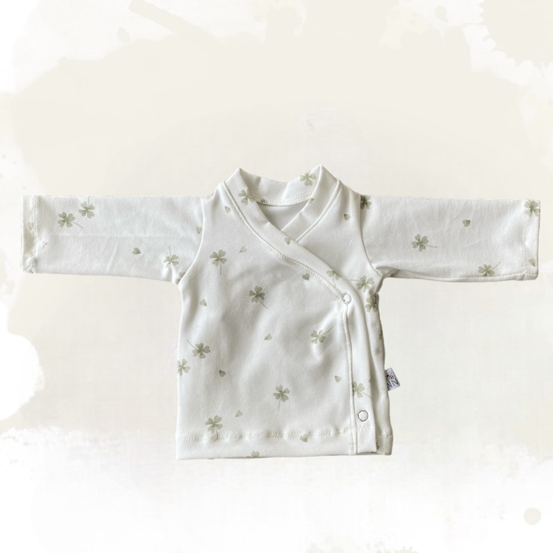 Dit lieve Overslagshirtje Klavertjes in een zachte off-white kleur met een schattige print van Klavertjes is een must-have voor de garderobe van jouw baby. Het overslagshirtje is leuk te combineren met het groene broekje Klavertjes.