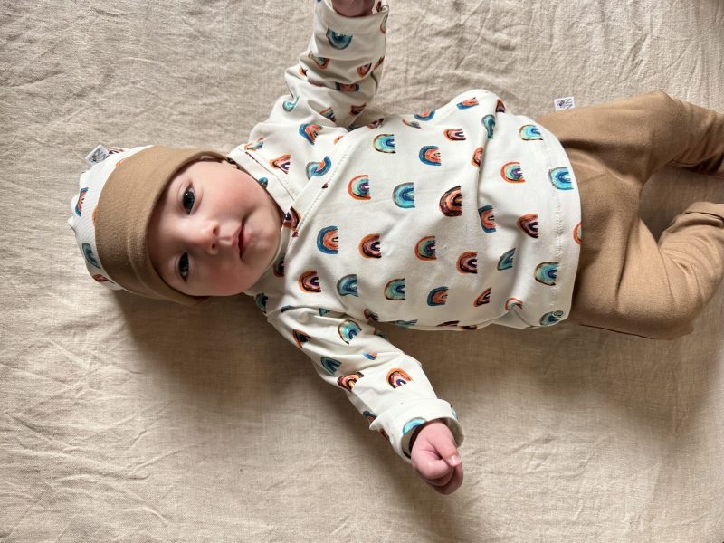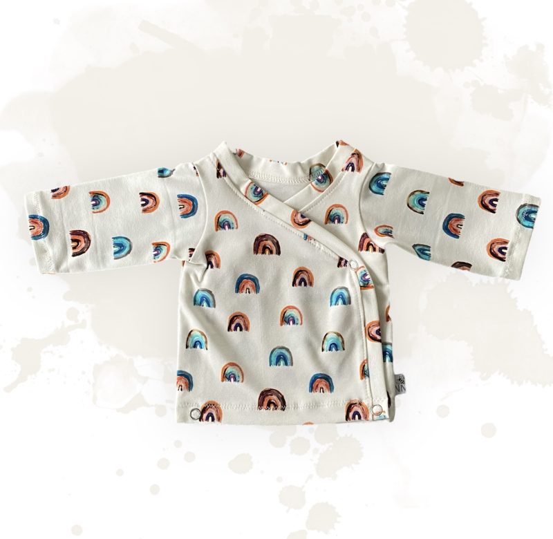 Dit lieve superzachte Off-white kleurige overslagshirtje met print van regenboogjes is gemaakt van 95% katoen met 5% elasthan. Oeko-Tex Katoen is beter voor de tere babyhuid doordat er geen schadelijke stoffen in verwerkt zijn.
