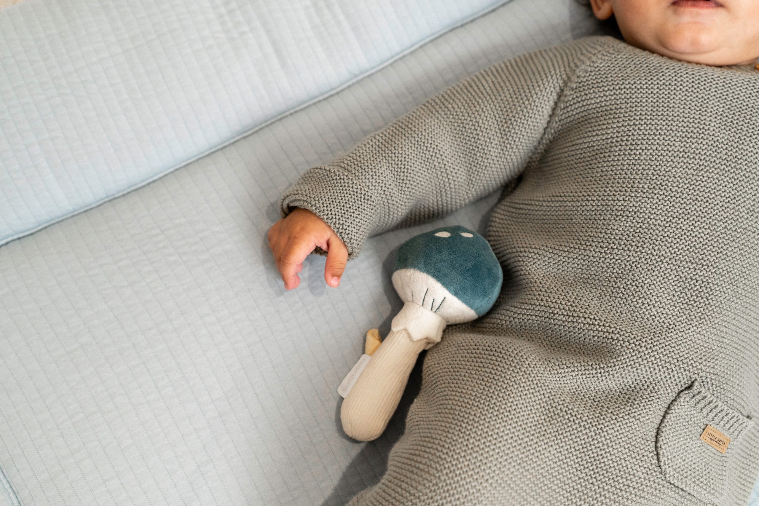 Deze schattige rammelaar is ontworpen in de vorm van een mooie paddenstoel, met mooie witte stippen en verschillende texturen die de nieuwsgierigheid van de baby zullen prikkelen. Elke keer dat het kindje de rammelaar beweegt, klinkt er een zacht rammelgeluid dat zorgt voor urenlang speelplezier.