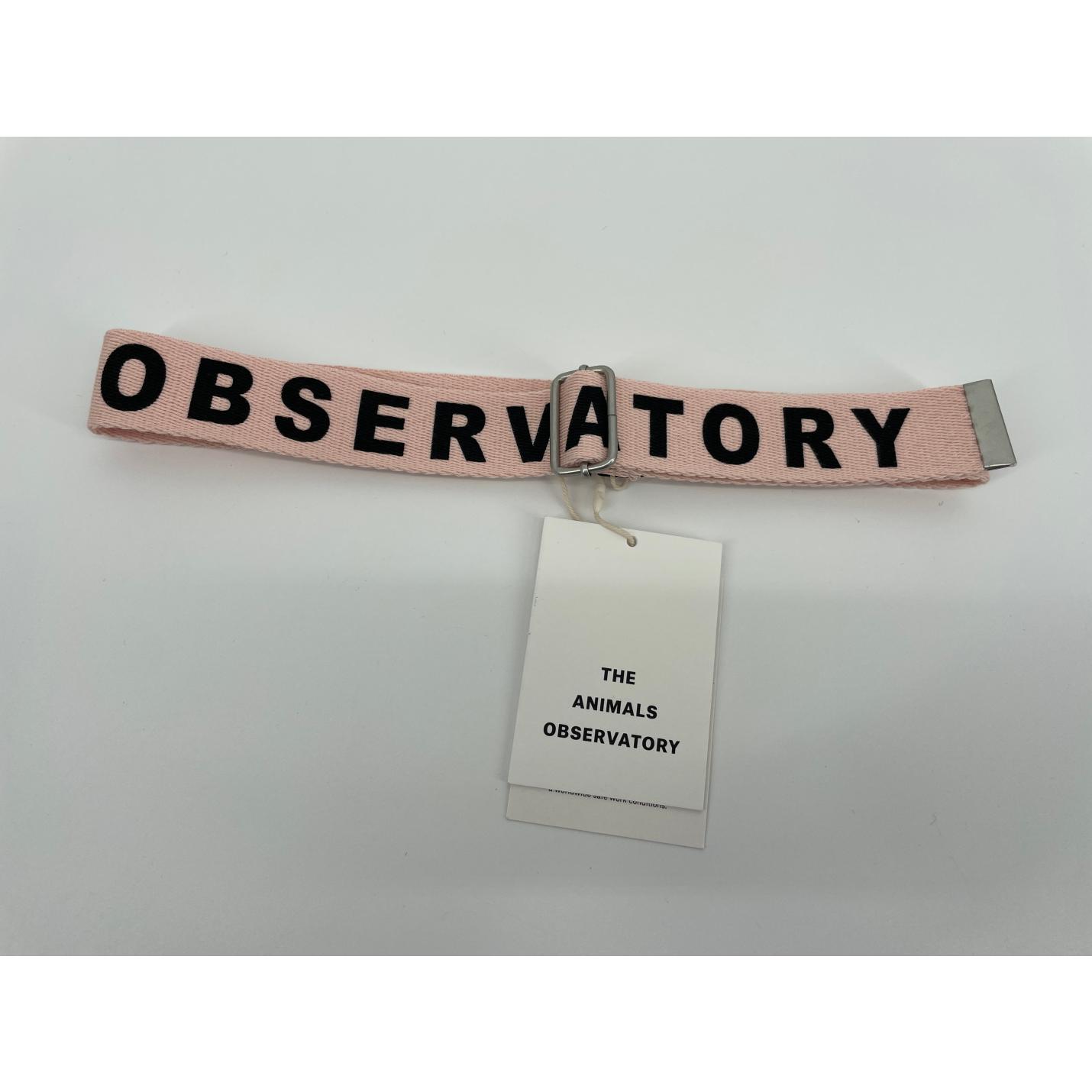 Roze riem van The Animals Observatory met rondom in zwarte letters de tekst THE ANIMALS OBSERVATORY, zie foto's. Hij sluit met een schuifgesp.