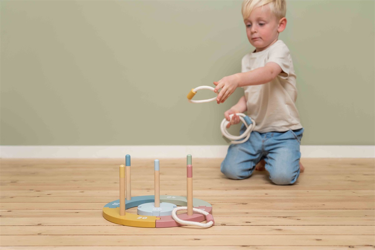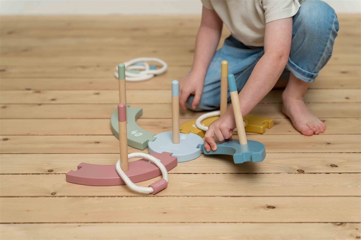 Het ringwerpspel van Little Dutch is een klassiek spel dat geschikt is voor zowel binnen als buiten. Het spel bevat vijf houten palen met verschillende puntenwaardes en zes zachte ringen in vrolijke kleuren. Het doel van het spel is om de ringen om de palen te werpen en zoveel mogelijk punten te scoren.