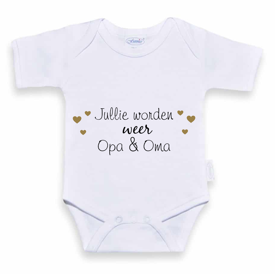 We bedrukken de rompertjes zelf, het is dus ook mogelijk om de tekst aan te laten passen. Laat het ons weten als je een andere tekst wenst. Naast het rompertje met de tekst 'Jullie worden weer opa en oma' hebben we ook rompertjes met de tekst 'Jullie worden opa en oma', 'Jullie worden pake en beppe', 'Je wordt opa', 'Je wordt oma', 'Jullie worden oom en tante', etc.