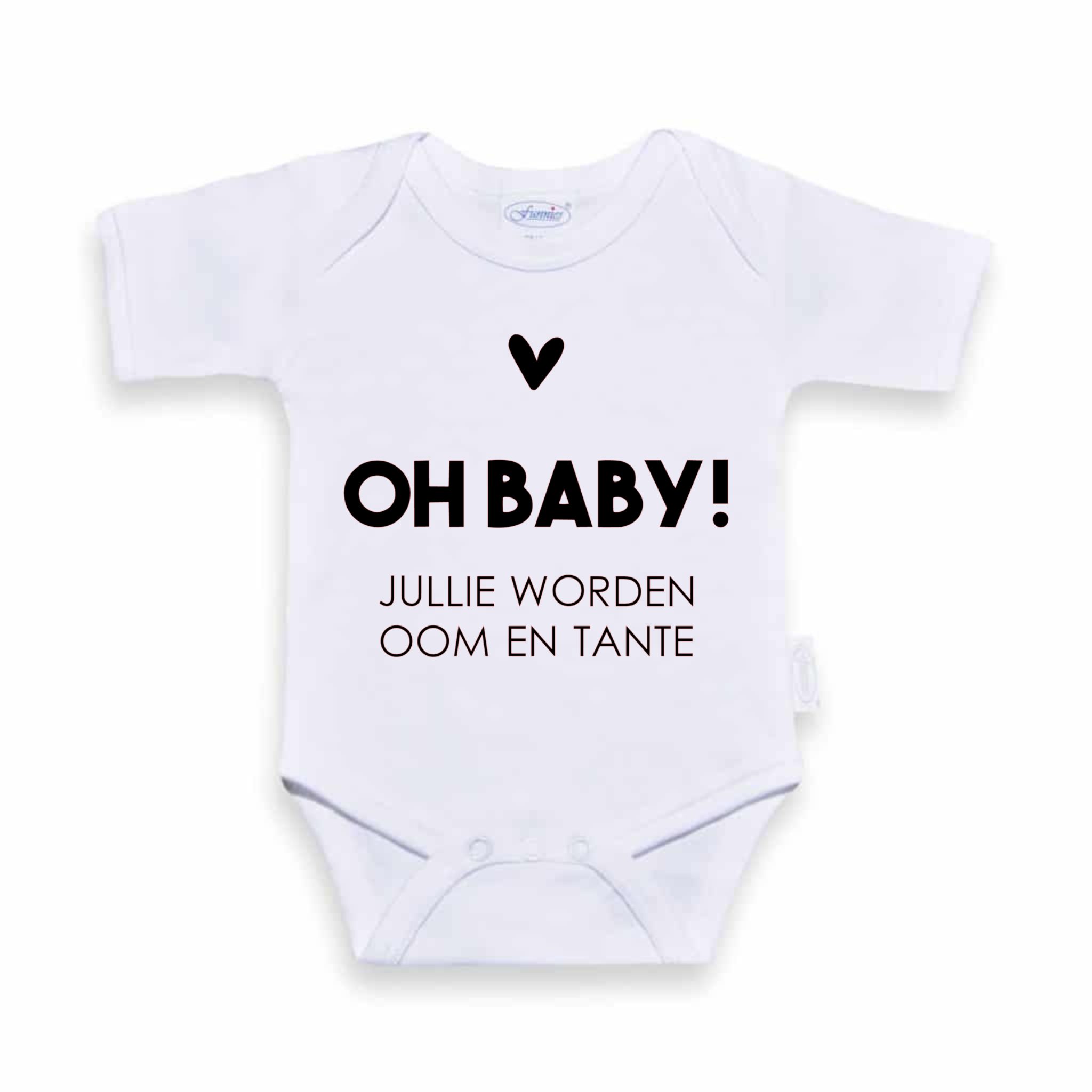 We bedrukken de rompertjes zelf, het is dus ook mogelijk om de tekst aan te laten passen. Laat het ons weten als je een andere tekst wenst. Naast het rompertje met de tekst ‘Oh baby! Jullie worden oom en tante’ hebben we ook rompertjes met de tekst ‘Jullie worden oom en tante’, ‘Mijn tante is de allerliefste’, ‘Mijn oom is de allerliefste’ , ‘Je wordt tante’, ‘Je wordt oom’, etc.