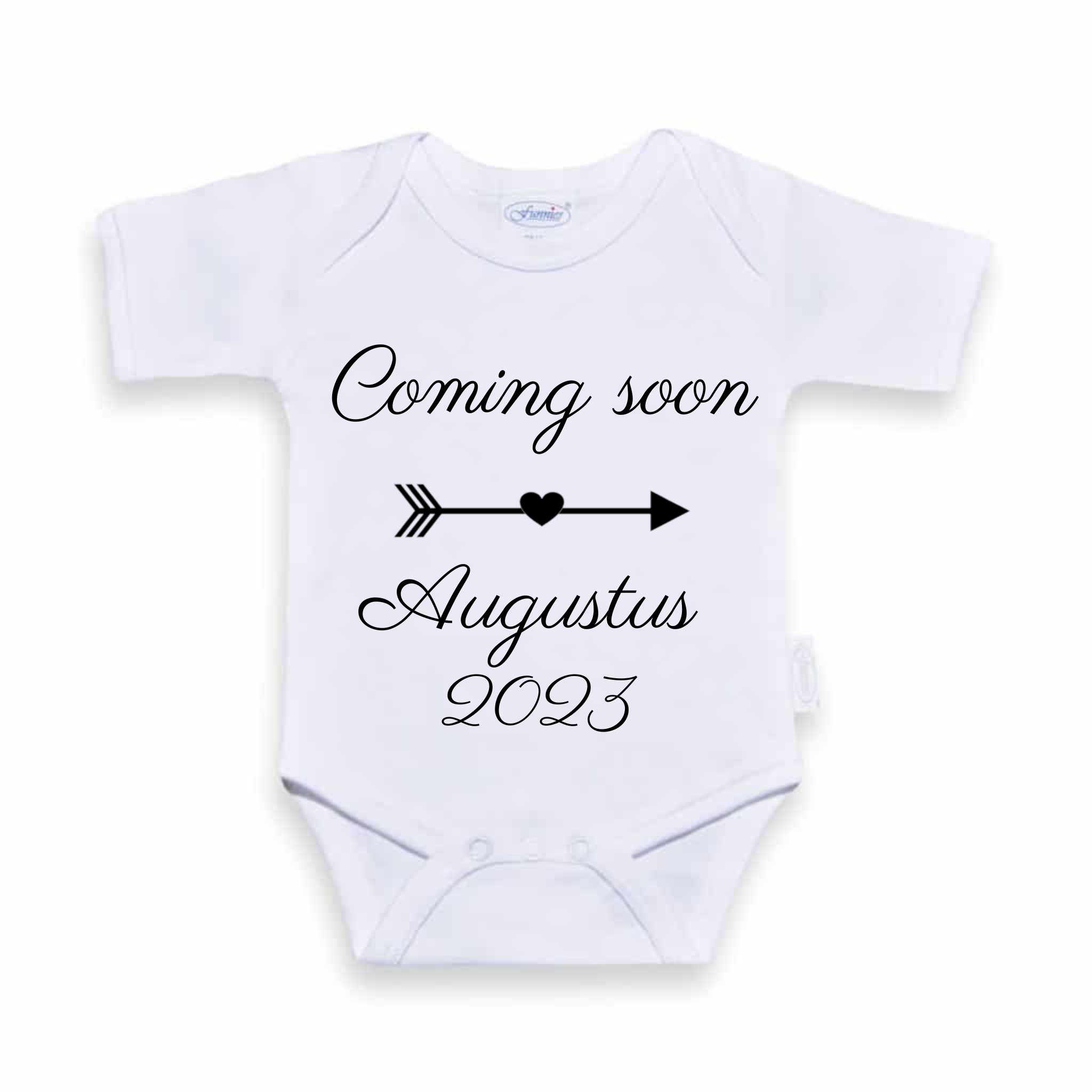 De tekst die op het rompertje kan staan is bijvoorbeeld 'Coming Soon | Augustus 2023'