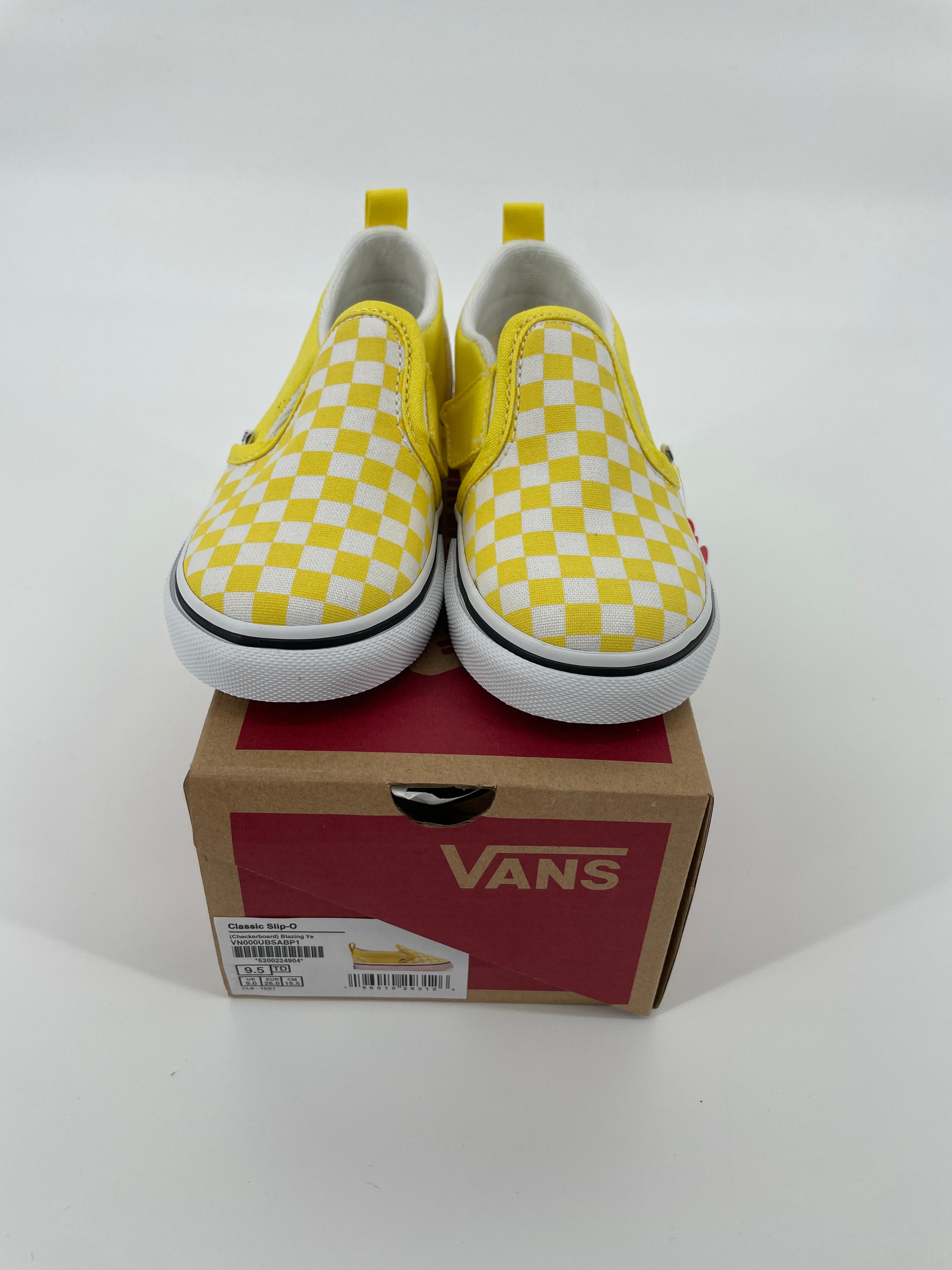 Geel met wit geblokte Vans slip on schoenen met aan de binnenzijde een klittenbandje voor makkelijk aan- en uittrekken.