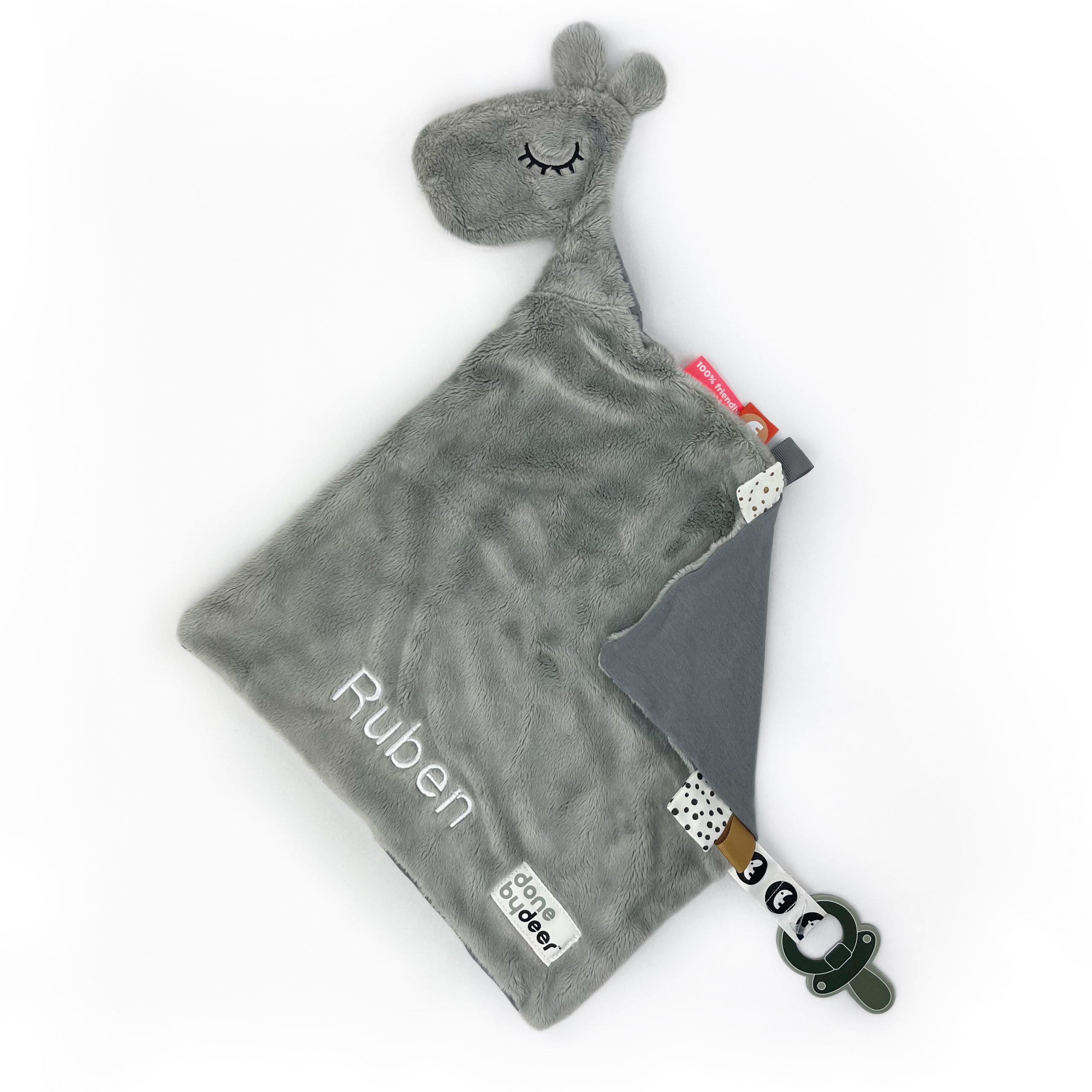 Indien gewenst borduren we de naam van het kindje op het Done by Deer knuffeldoekje, dat maakt je cadeau persoonlijk en uniek.
