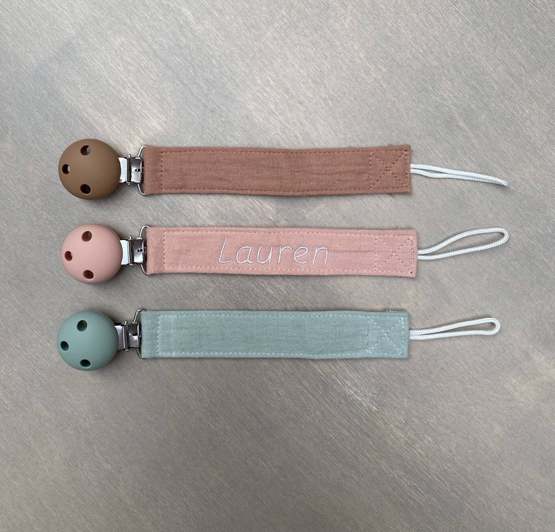We borduren de naam van het kindje op het speenkoord. Stijlvol, handig en persoonlijk!