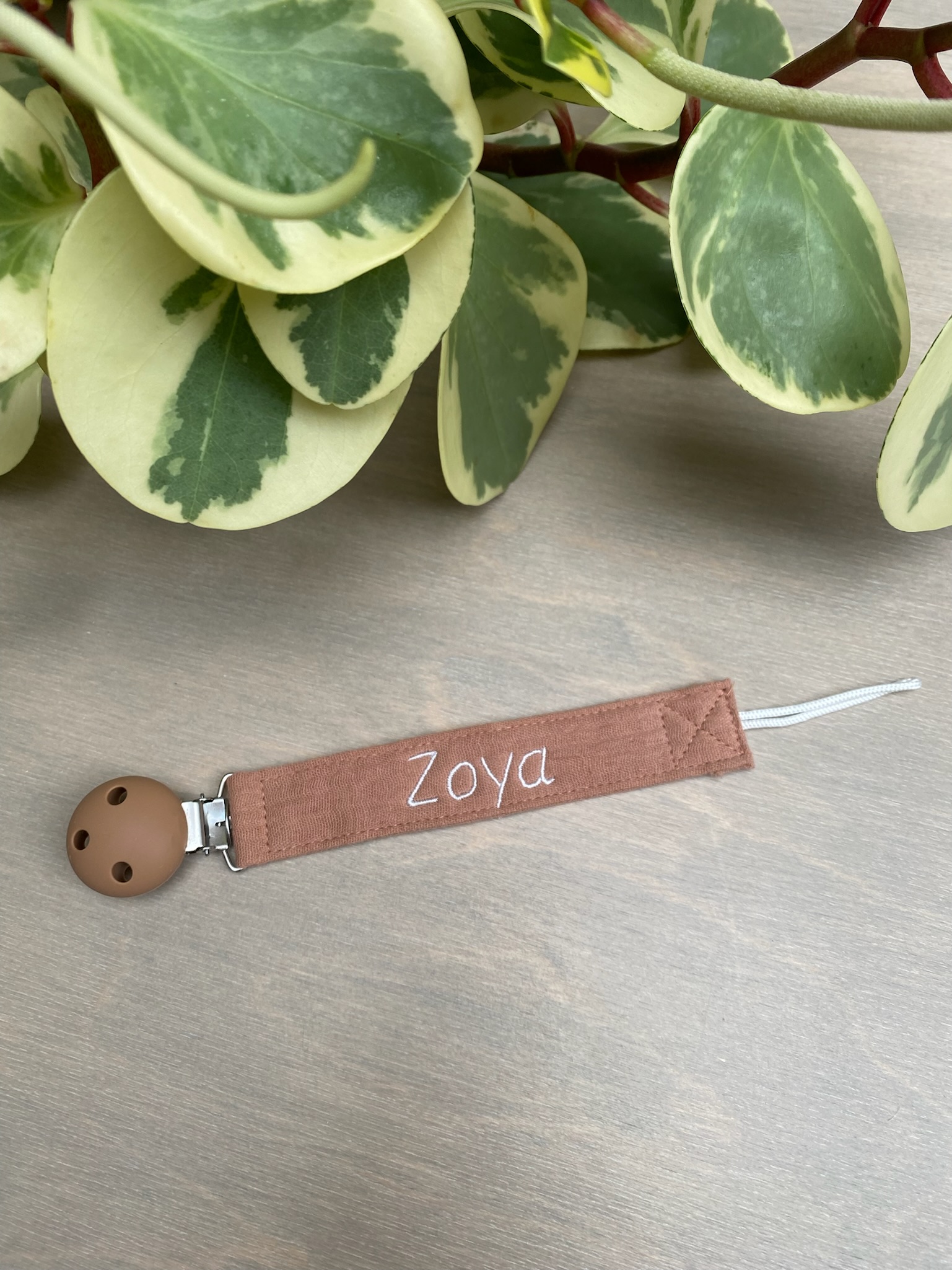 We hebben het speenkoord met naam in diverse kleuren verkrijgbaar: oudroze, groen en bruin.