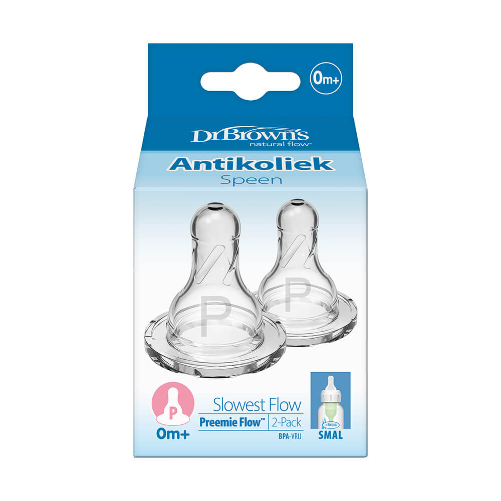 Dr.Brown’s prematuur flesspeen is speciaal ontwikkeld voor premature baby’s. Ook geschikt voor baby’s die anderszins moeite hebben met drinken, bijvoorbeeld door verminderd zuigreflex. De flesspeen heeft een extra klein gaatje, waardoor de voeding nooit te snel doorstroomt. Lees hier de uitgebreide informatie.