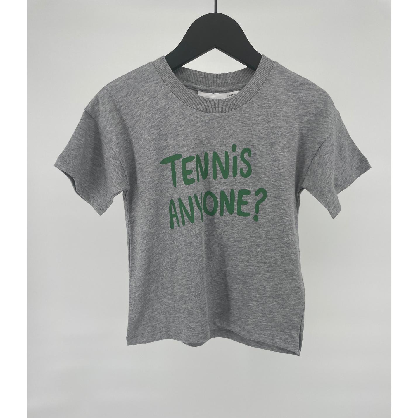 Grijs t-shirt van Mini Rodini met voorop de tekst ‘Tennis Anyone?’ In groene letters, zie foto’s.