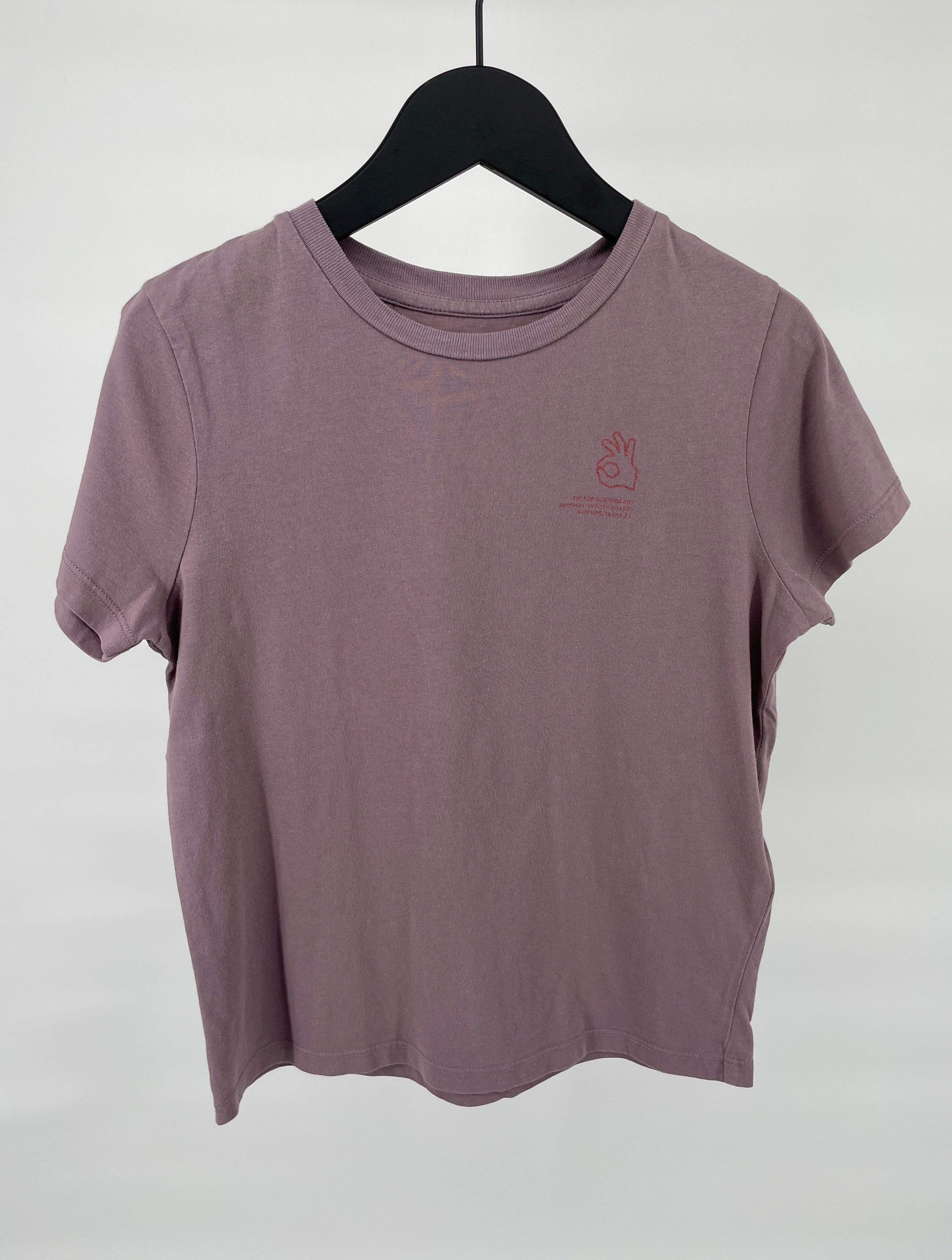 Paars t-shirt van Bellerose in maat 128. Op de rug staat een grote print van een palmboom en surfboard en daaronder de tekst Tip Top Surfboards, zie foto’s. Voorop staat op de borst een heel klein printje in rood van Tip Top turfboards, zie foto’s.