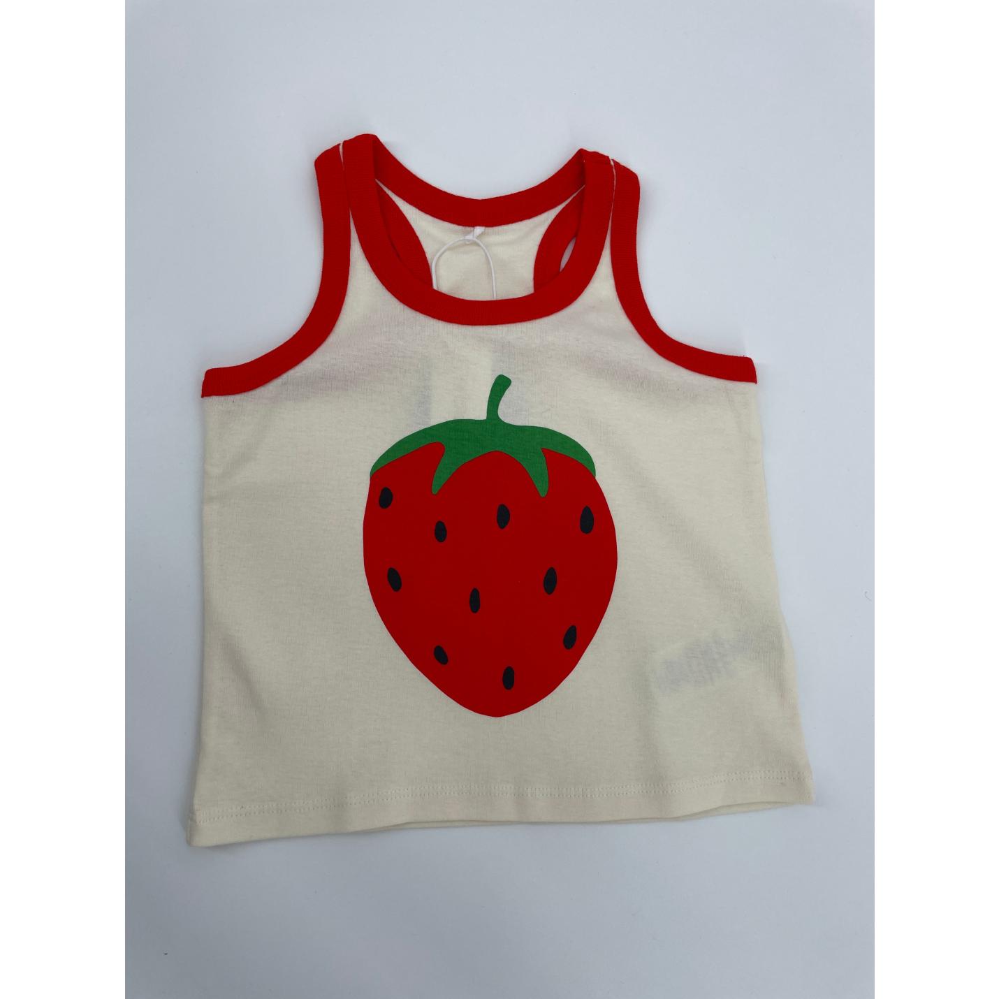Beige tanktop met aardbei van Mini Rodini in maat 92 / 98. Racerback en rode accenten, zie foto’s.