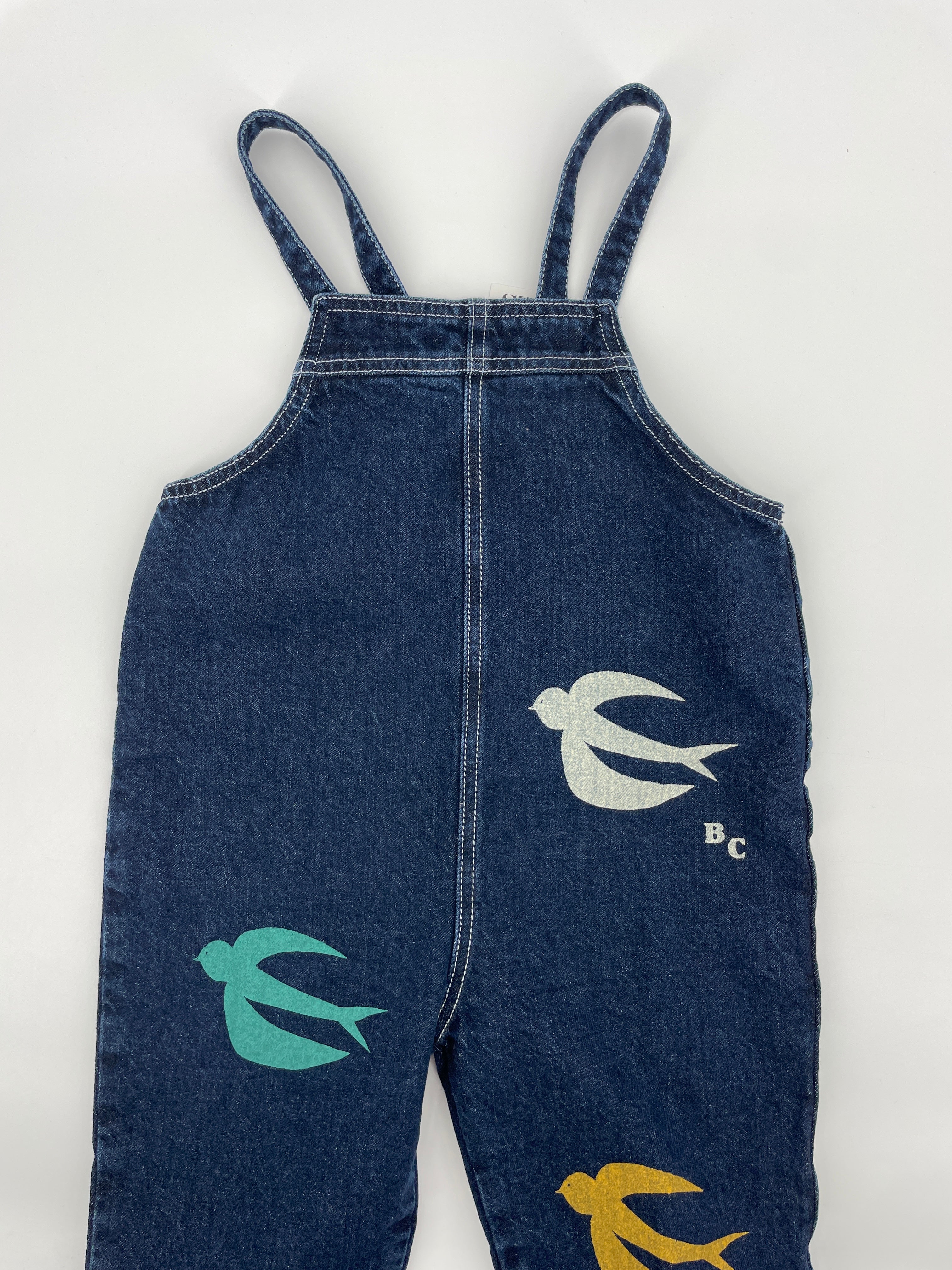 Donkerblauwe denim tuinbroek met print van vogels van Bobo Choses in maat 86 / 92. Met schouderbandjes die je op twee standen kunt stellen met een knoopje, zie foto’s.