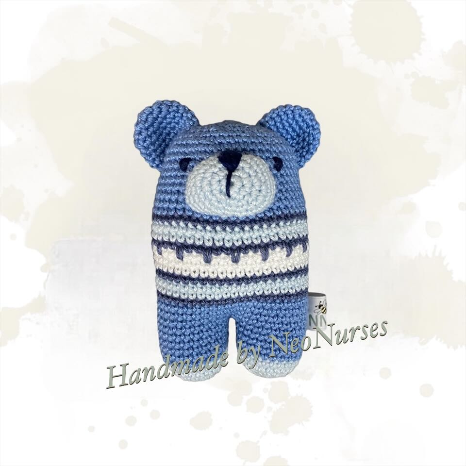 Deze knuffel werd gemaakt door NeoNurses aan de hand van een patroon van Lanukas.
