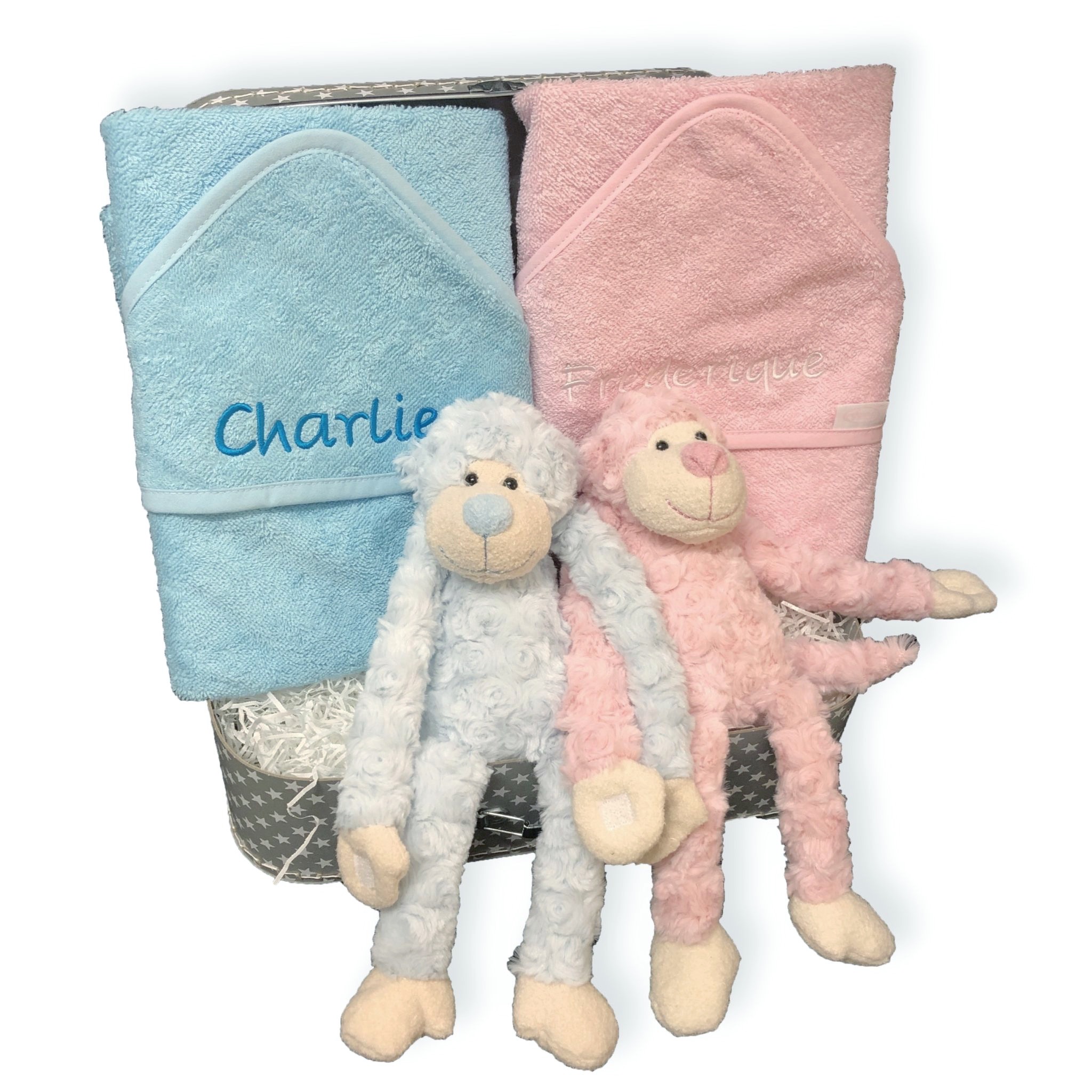 Dit koffertje is een origineel kraamcadeau voor een tweeling. Op de badcapes borduren we de namen van de kindjes. En natuurlijk mogen deze leuke knuffelapen niet ontbreken.