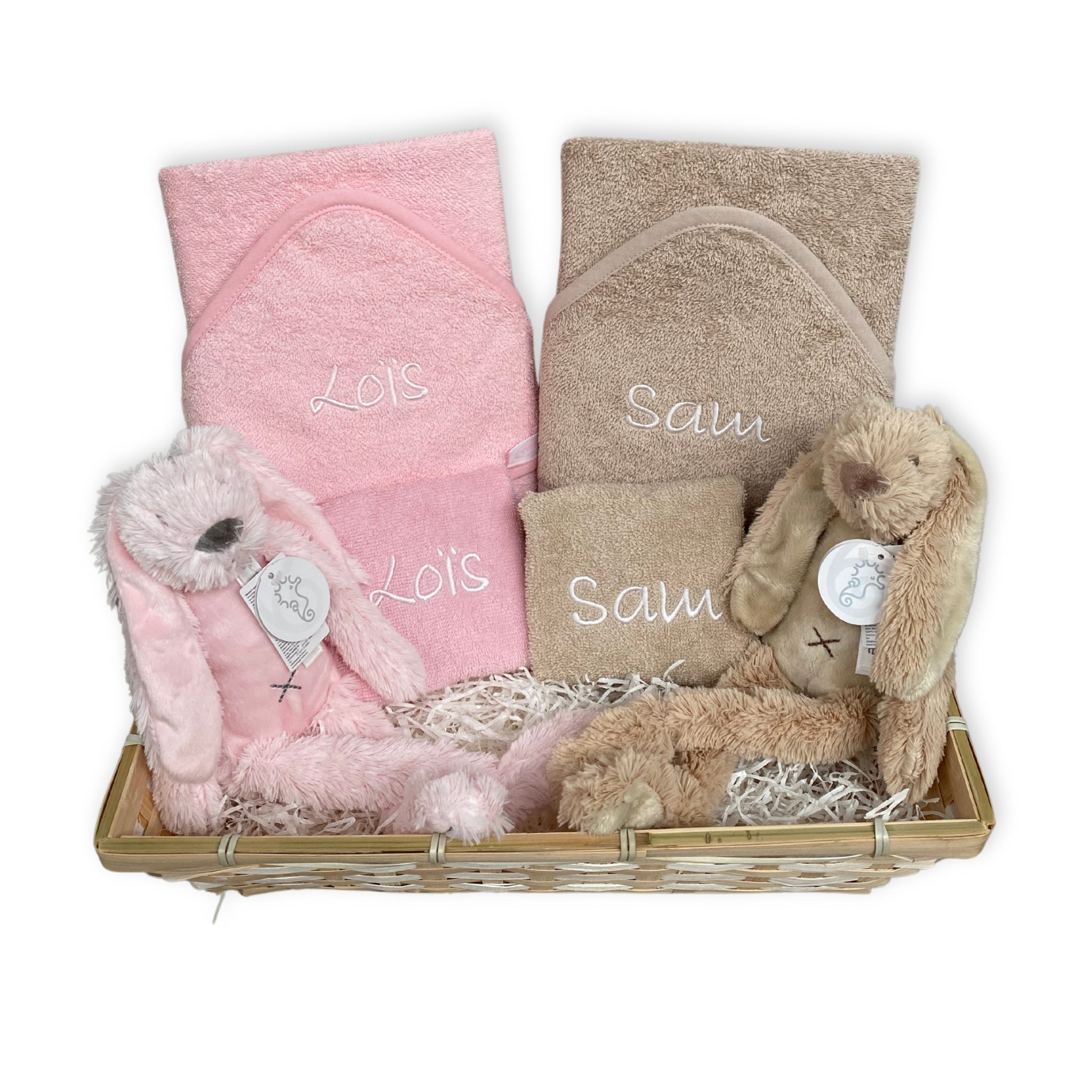 We hebben een kraammand samengesteld in vrolijke kleuren, geschikt voor tweeling jongens en meisjes. Op de badcapes, slabbetjes en de oren van de konijnen borduren we de namen van de kindjes.