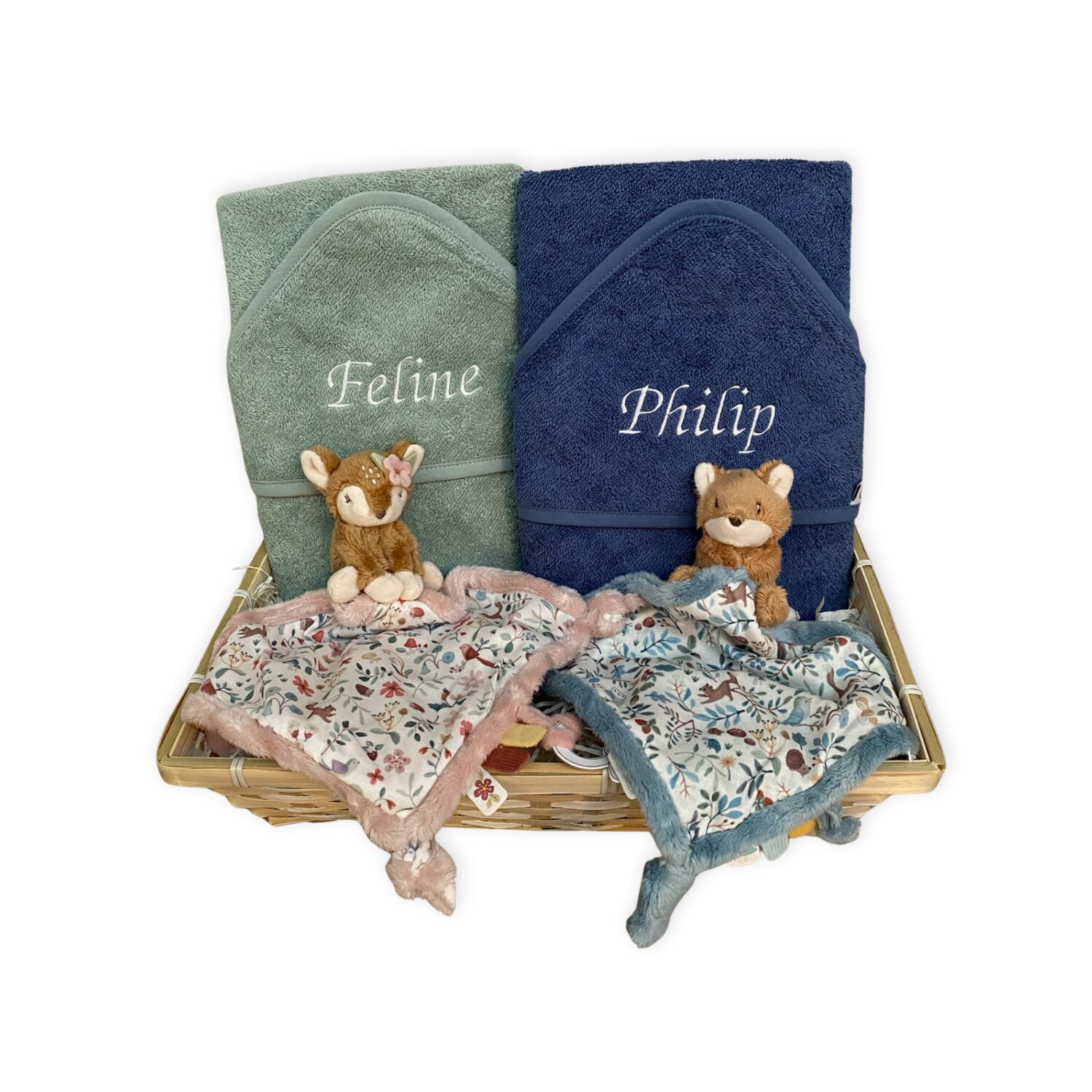 We hebben een kraammand samengesteld in vrolijke kleuren, geschikt voor een tweeling. Op de badcapes borduren we de namen van de kindjes, met de knuffel speendoekjes houden de ouders de speentjes uit elkaar; die komen gewoon altijd van pas!