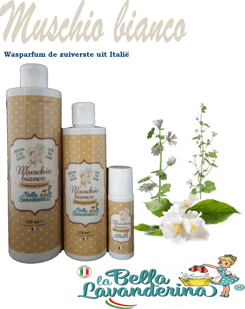 Wasparfum Muschio Bianco - Een elegant en intens wasparfum van witte musk. Dit wasparfum is herkenbaar aan de bloemige frisse geur en is heerlijk voor je beddengoed en handdoeken!