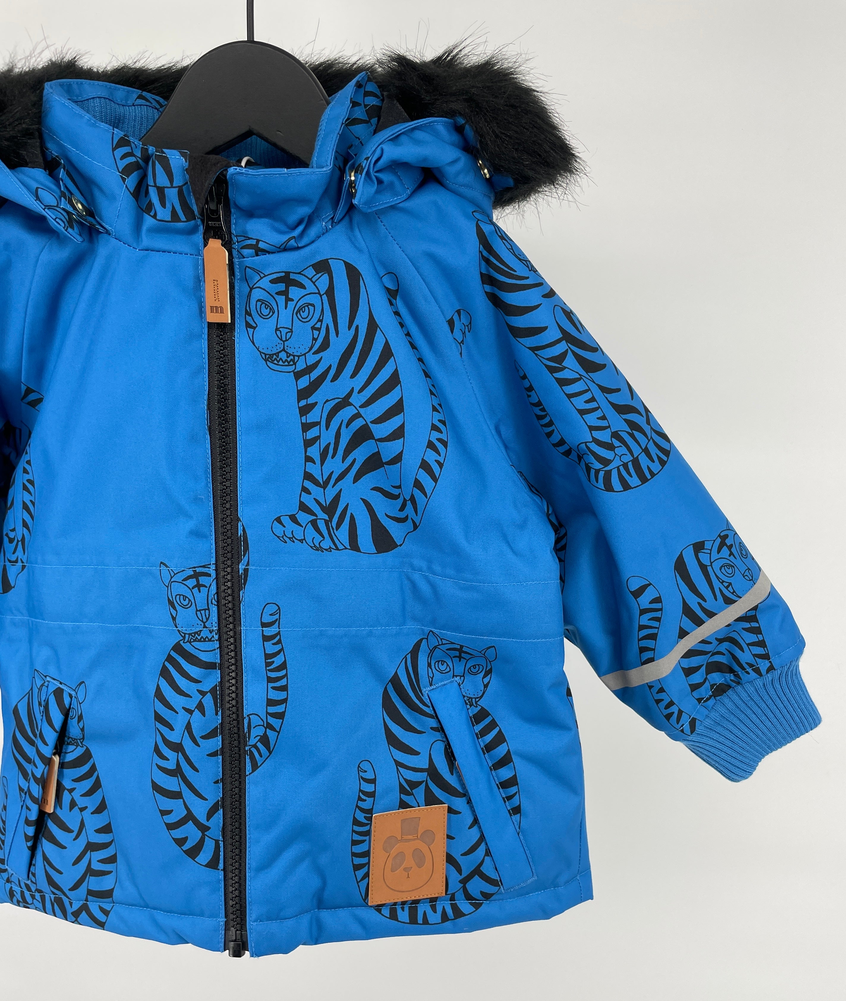 Blauwe winterjas met all over tijgerprint van Mini Rodini in maat 80 / 86. Hij sluit met een rits, heeft voorop twee zakken met ritssluiting en een panda applicatie.…