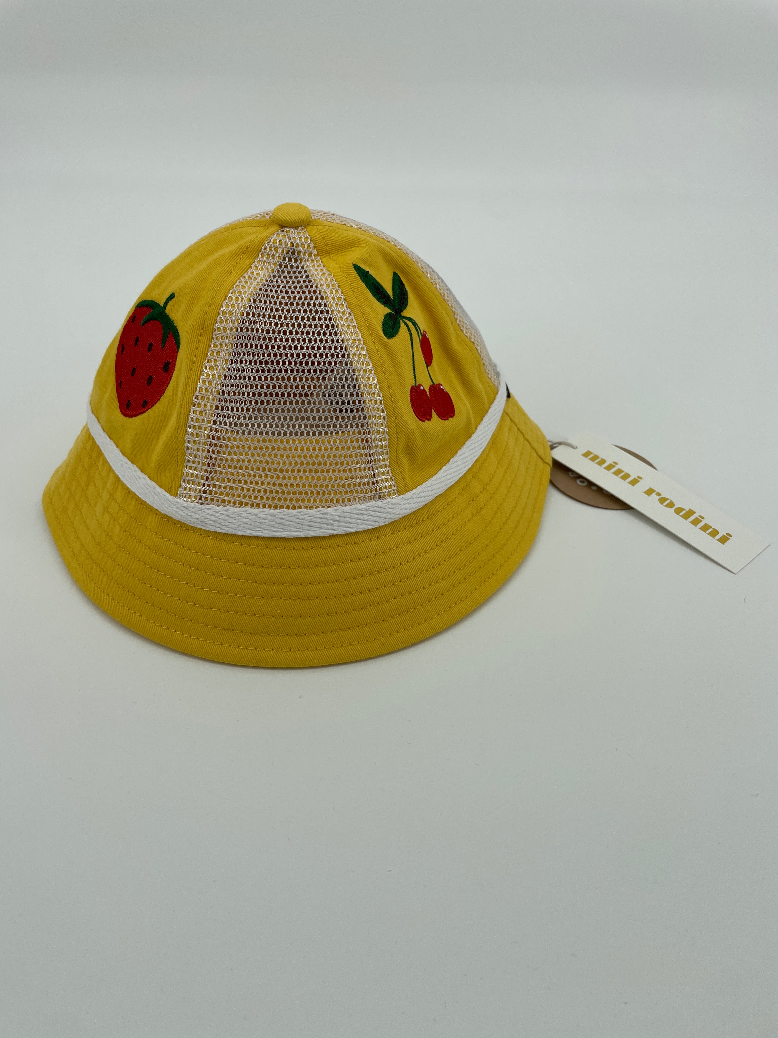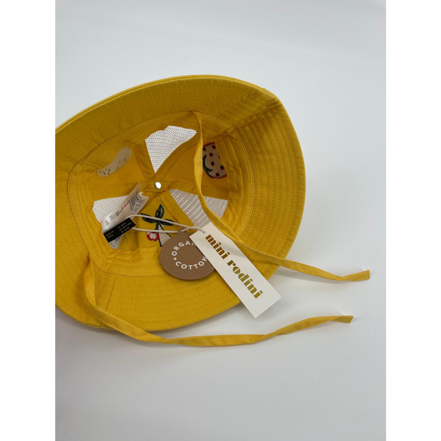 Geel zonnehoedje van Mini Rodini Het hoedje bestaat uit gele delen met geborduurde applicaties van citroen, aardbei en kersen en witte mesh delen, zie foto's. Het hoedje heeft koordjes om onder de kin te strikken.